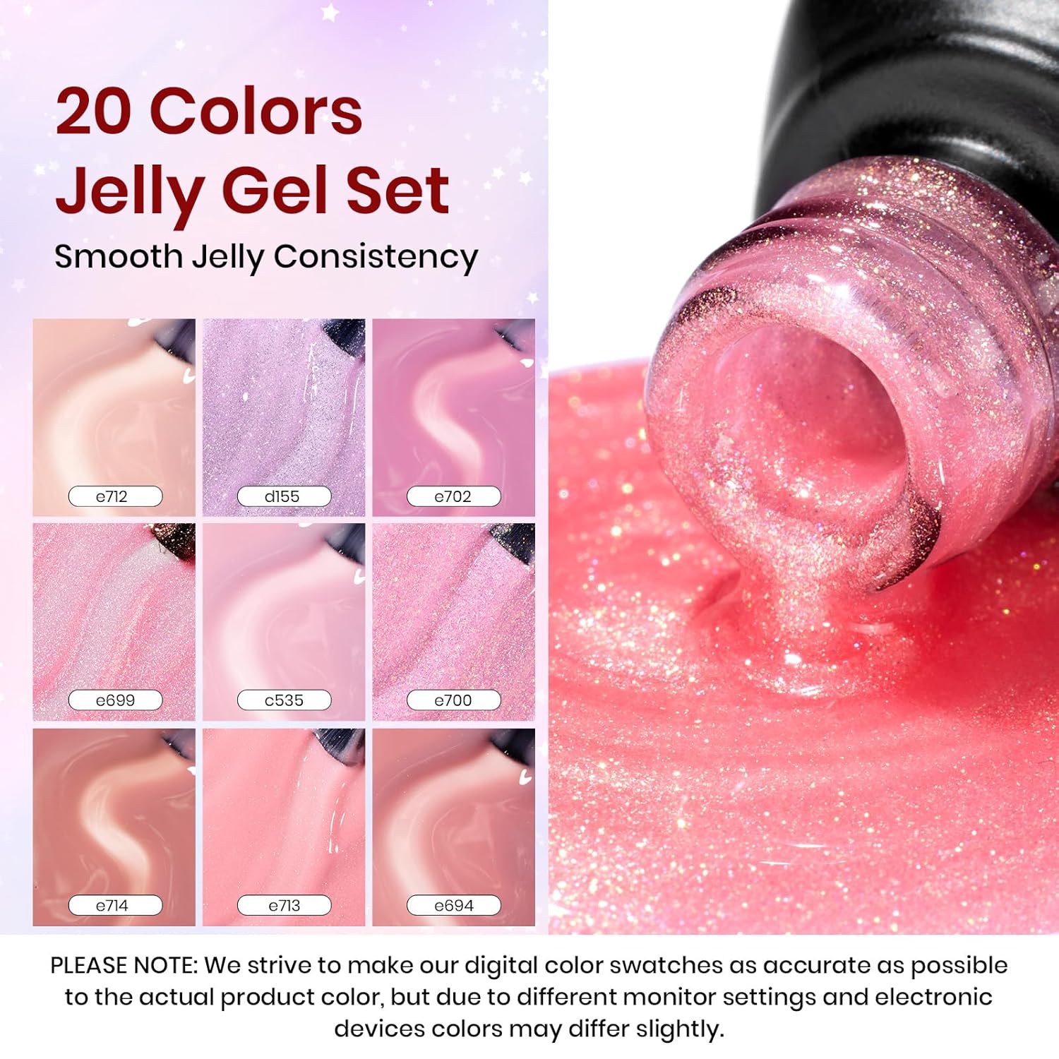 - 【Sheer Jelly Gel Styles】Apply several layers to build up the color from clear translucent to solid opaque. Each layer, whether one, two, or three layers, creates a different effect. The jelly gel and cat eye gel is UV gel and need to be cured 60-120s.