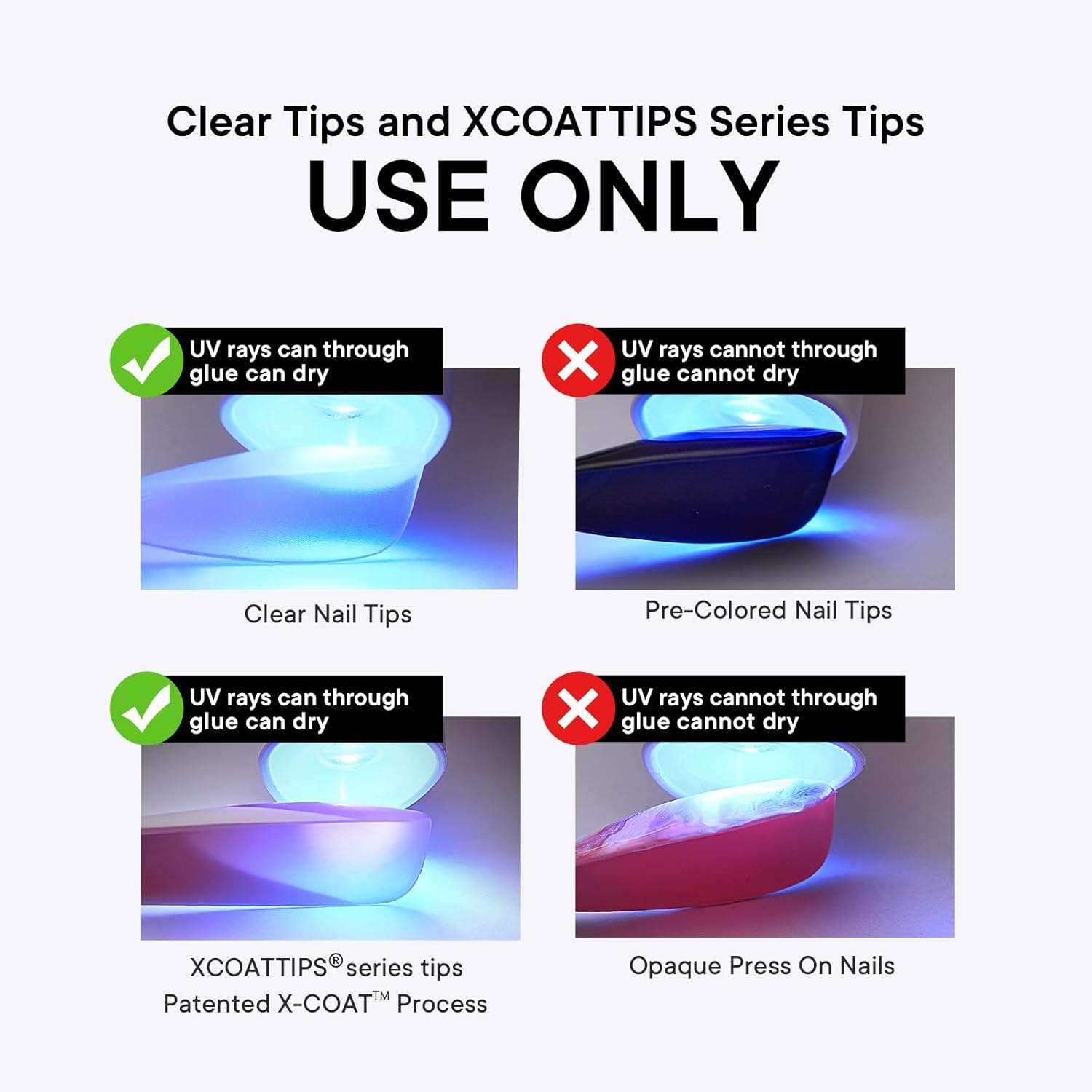 - This Nail Glue Only supports clear nails and xcoattips French Series, Cat eye Series, 2 IN 1 XCOATTIPS Series and Omber Series. The following products cannot be used. 1. press on nails. 2. Any other nail with color from other brands. 3. Xcoattips other solid/plated colors.