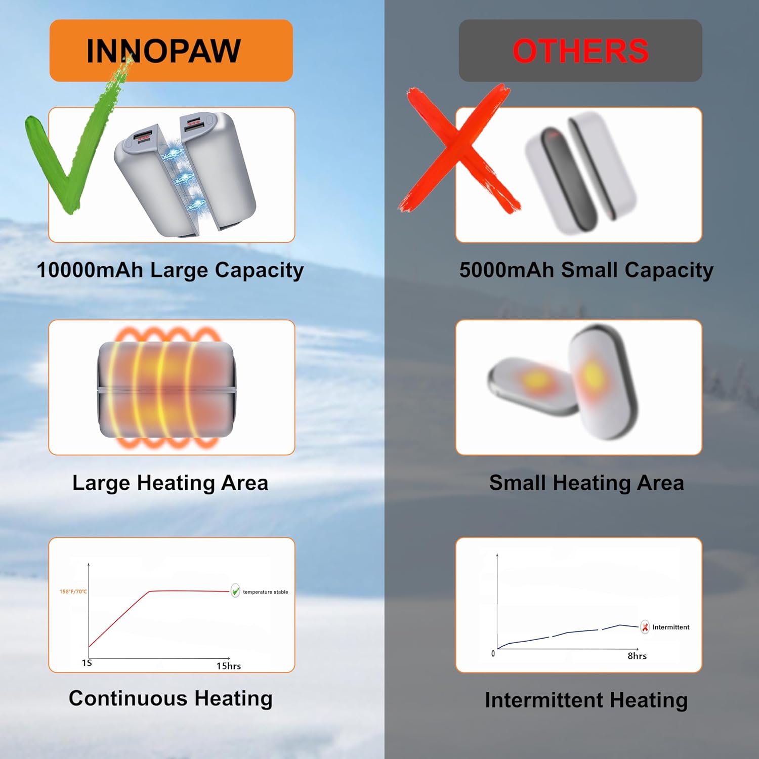- 3 DIFFERENT HEAT SETTINGS - 3 levels of temperature heating warms your both hands.Fast heating up in 3 seconds.Battery and heat indicator lights will show you the selected heat settings and battery remaining.
