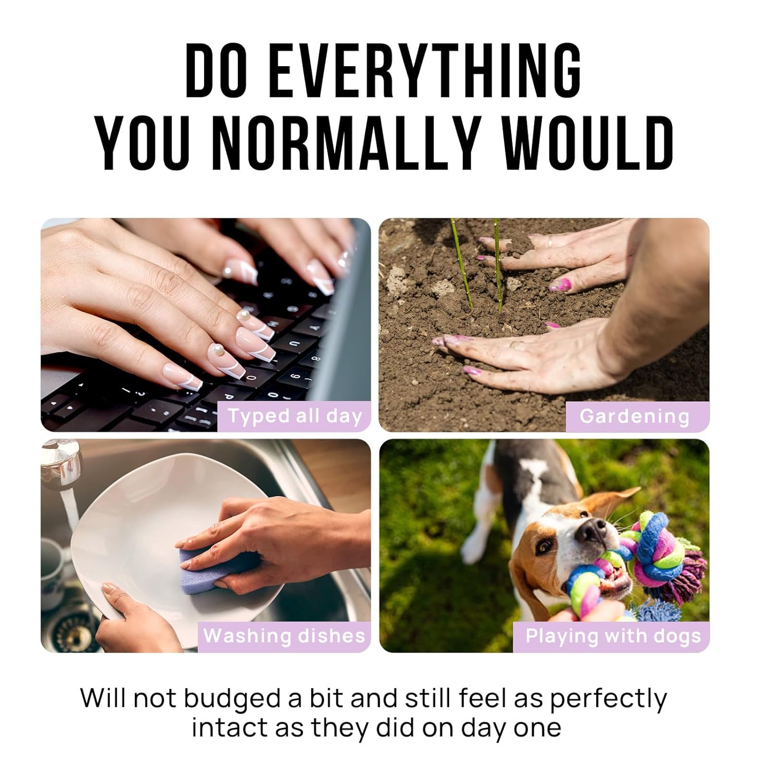 - Do Everything You Normally Would: All BTArtbox stick on nails offer feature protective building gel finish so that you are able to do everything you normally would, such as typing, gardening, house working or playing with your pet. They will not budged a bit and still feel as perfectly intact as they did on day one