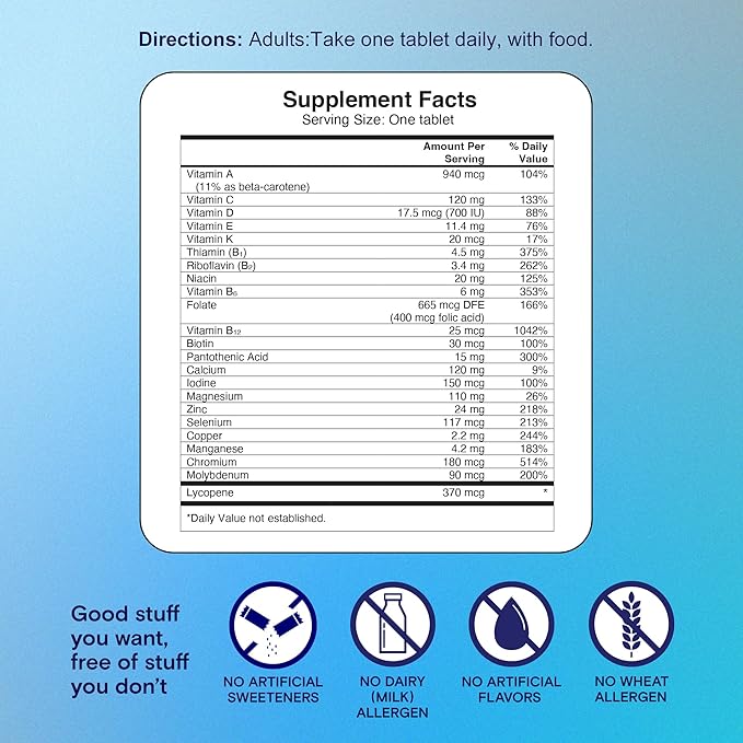 - FREE OF: Our multivitamin for men 50 plus is free of wheat allergen, dairy (milk) allergen, artificial flavors, and artificial sweeteners