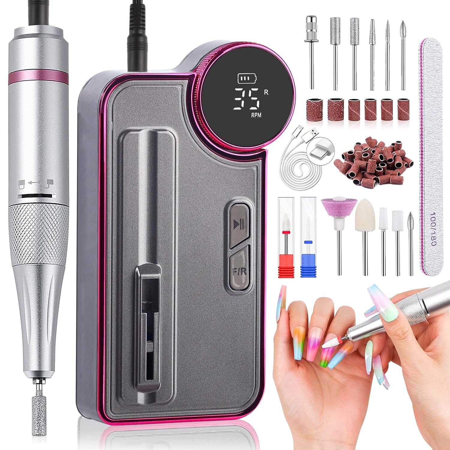 - 2024 Professional Nail Drill kit: With a high speed of 35,000 RPM, this nail drill is perfect for fast and efficient nail polishing. Equipped with a 2400 mAh battery, it provides up to 10 hours of use while operating quietly, with minimal vibration and heat. Featuring 13 different nail drill bits, this tool is designed to meet all your manicure & pedicure needs, making it ideal for beginners looking for easy control and use at home.