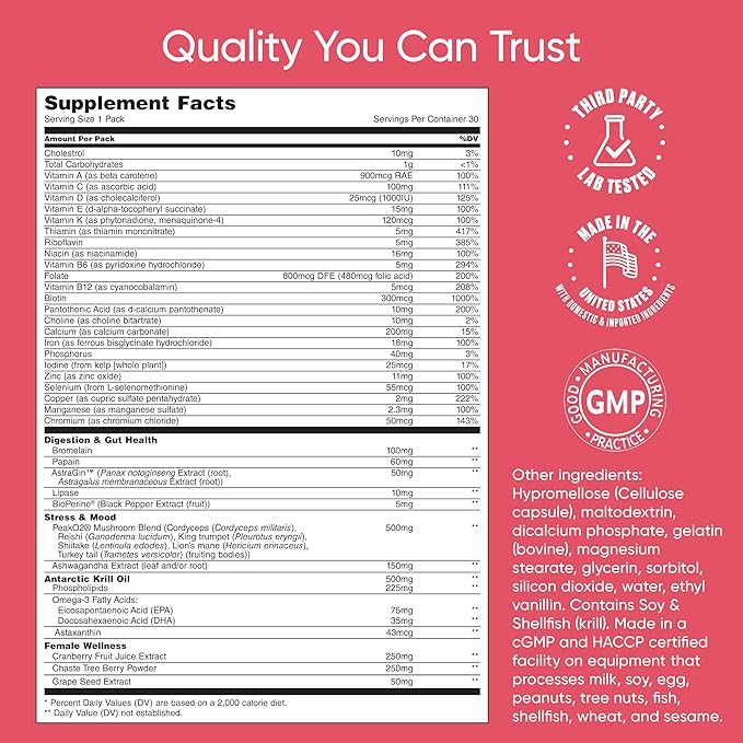 Women's Total Health Pack Daily Multivitamin Supplement, Energy, Stress & UT Support, Krill Oil, 22 Key Vitamins & Minerals, Iron, Biotin, Zinc, Selenium, Astaxanthin, Calcium (30 Pack)
