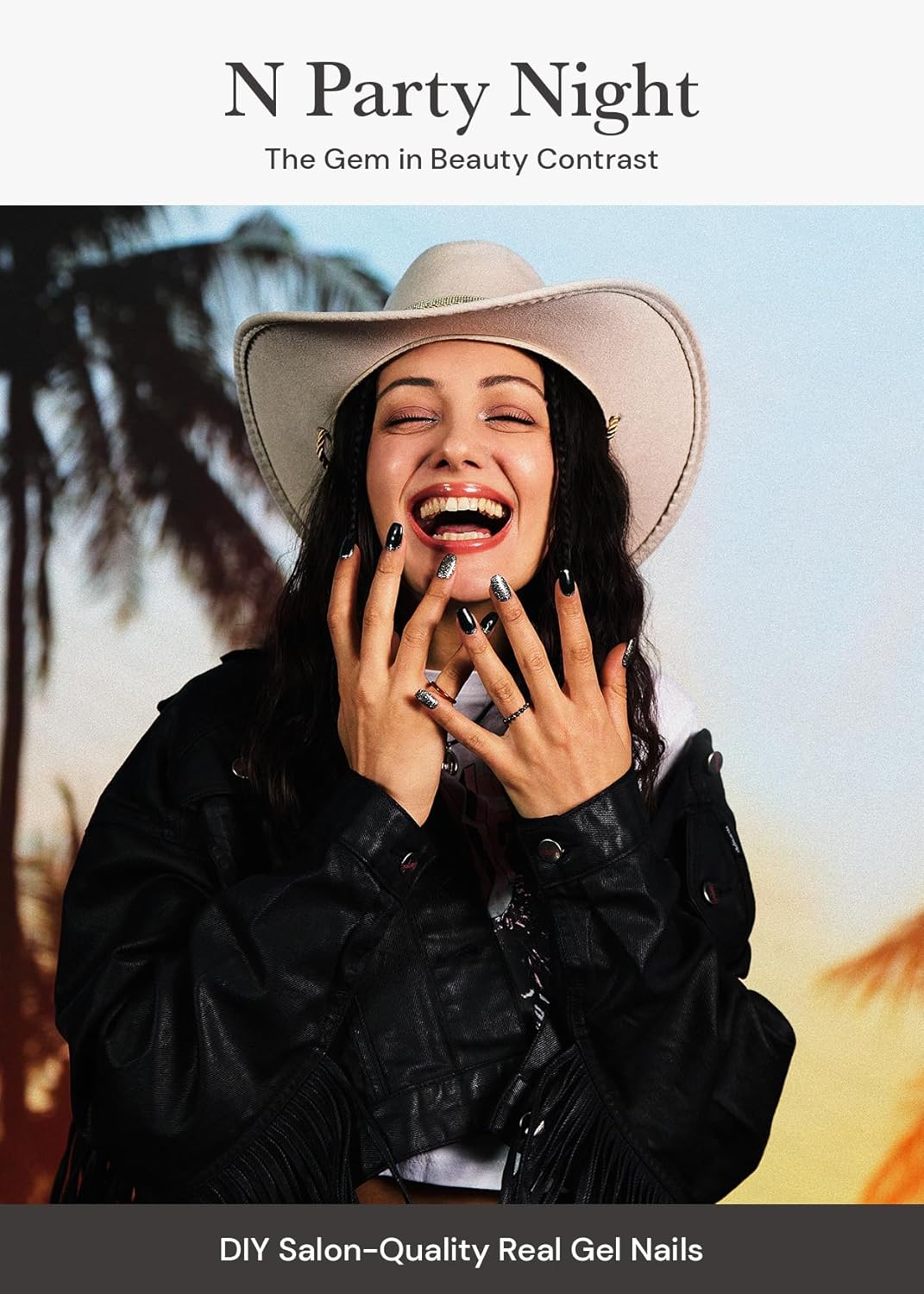 ohora Semi Cured Gel Nail Strips (N Party Night) - Dark, Glitter, Works with Any UV/LED Lamps, Salon-Quality, Long Lasting, Easy to Apply & Remove - Includes 2 Prep Pads, Nail File & Wooden Stick