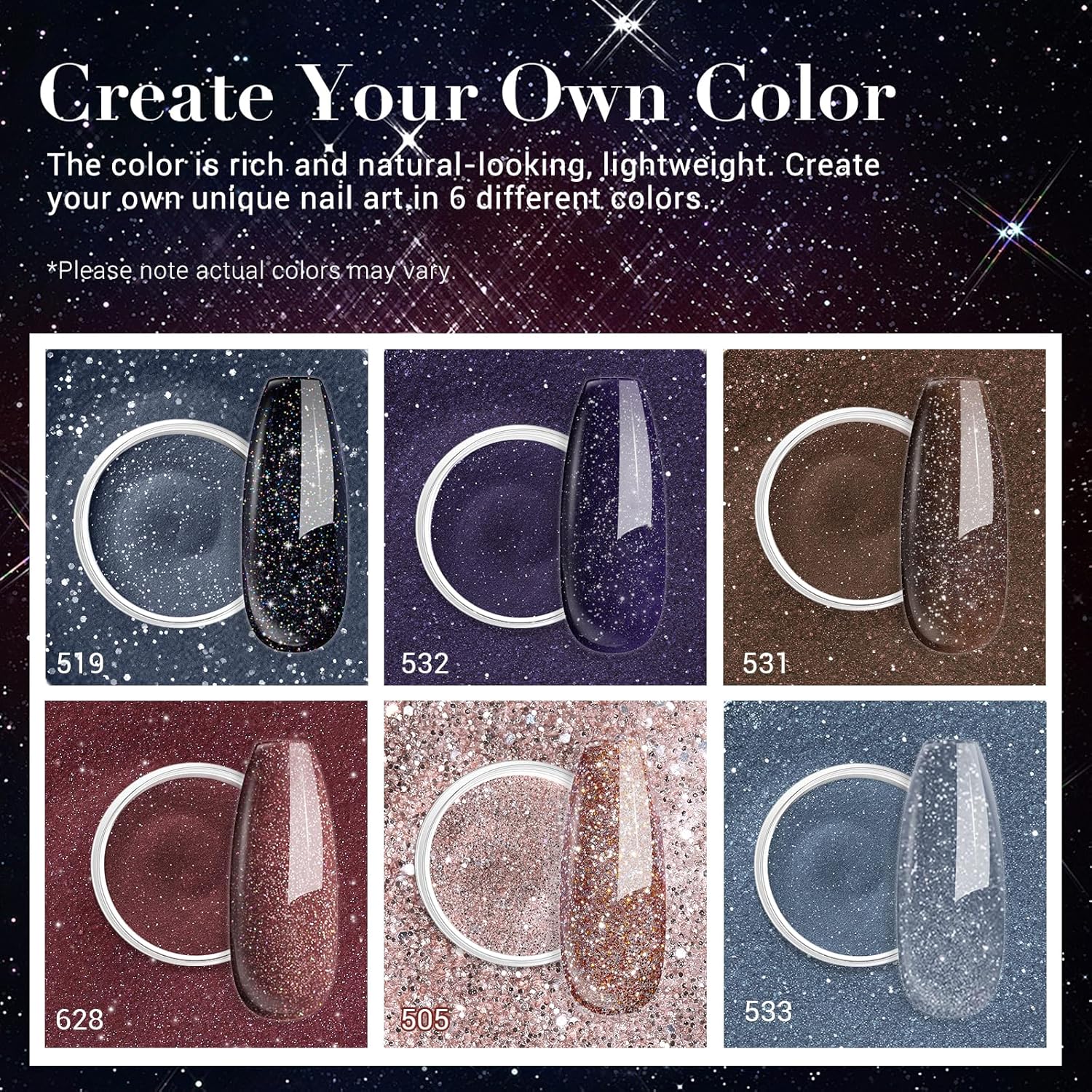 - What U Get: With this premium dip powder set covering 6 glitter colors, dark & light blue; wine red; purple; dark & light brown(10 g/box), your nails will look brilliant shiny finish, be lightweight, and more attractive