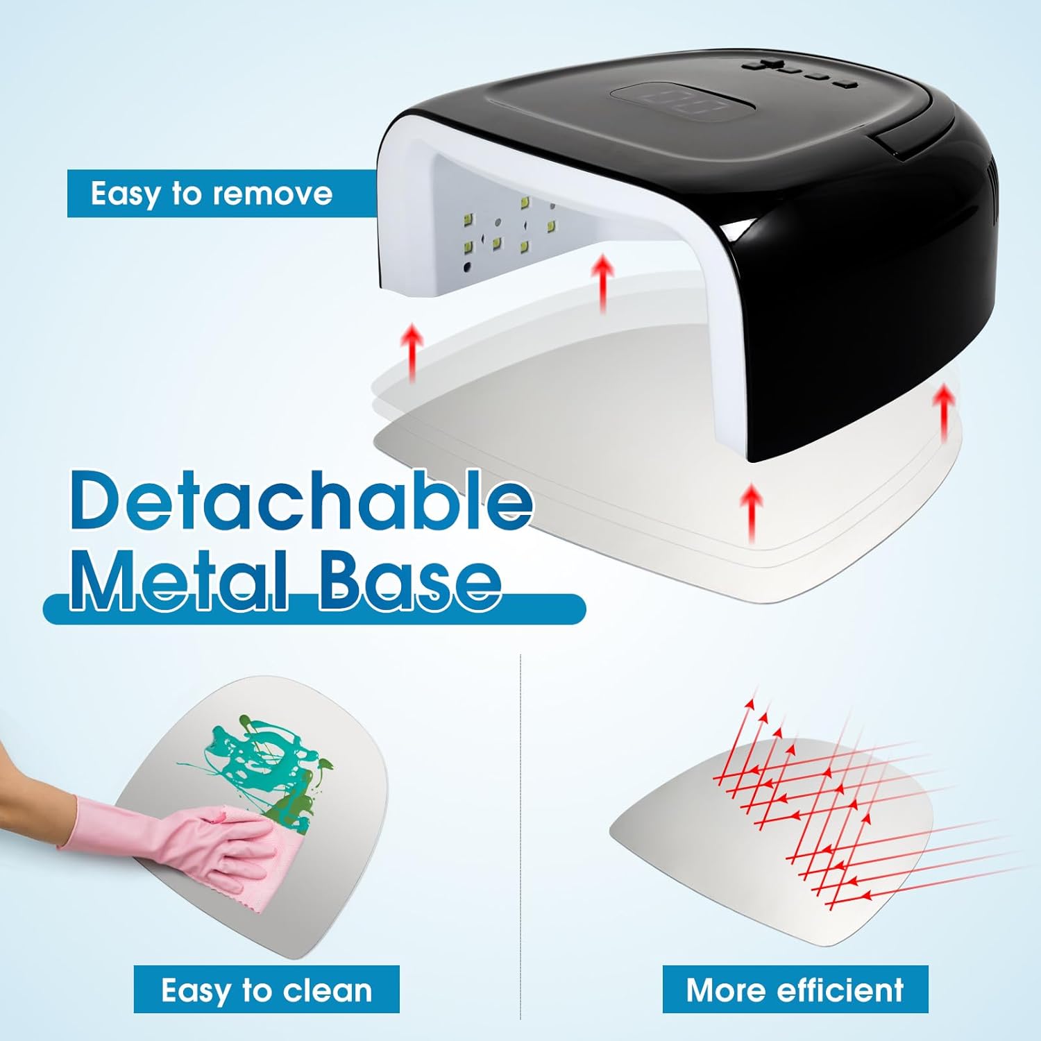 - [Detachable Base & Spacious Space] The uv lamp has a detachable base that makes it easy to remove and clean, and spacious space for curing fingernails and toenails at the same time, no need to worry about bumping sides or messing up the polish.