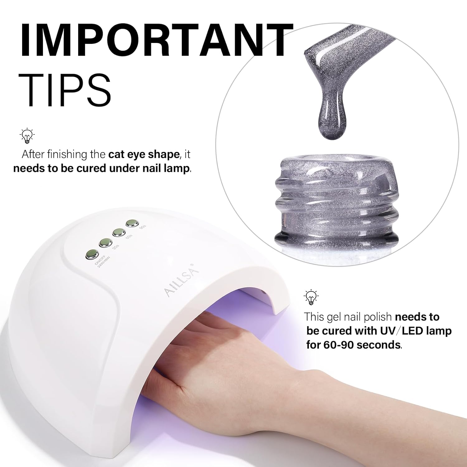 - CRYSTAL SPARKLING EFFECT - AILLSA Cat Eye Gel Nail Polish has a dense magnetic powder that can be used alone for a mirror-shimmering, crystal-clear manicure or with any base color nail polish, jelly gel nail polish, and other nail polishes.