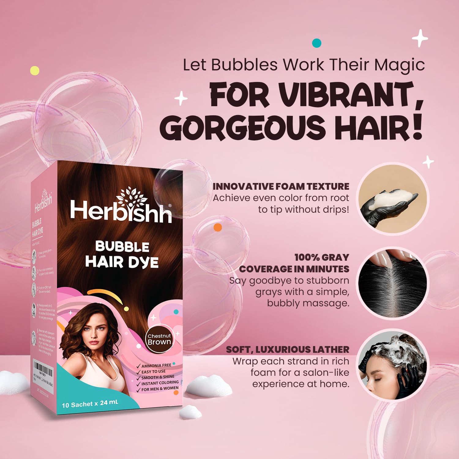 - CHESTNUT BROWN HAIR DYE SHAMPOO: Herbishh bubble hair dye shampoo protects and nourishes hair while turning gray strands into a rich chestnut brown color in just 15-20 minutes. (Note: Do a patch test before first use.)