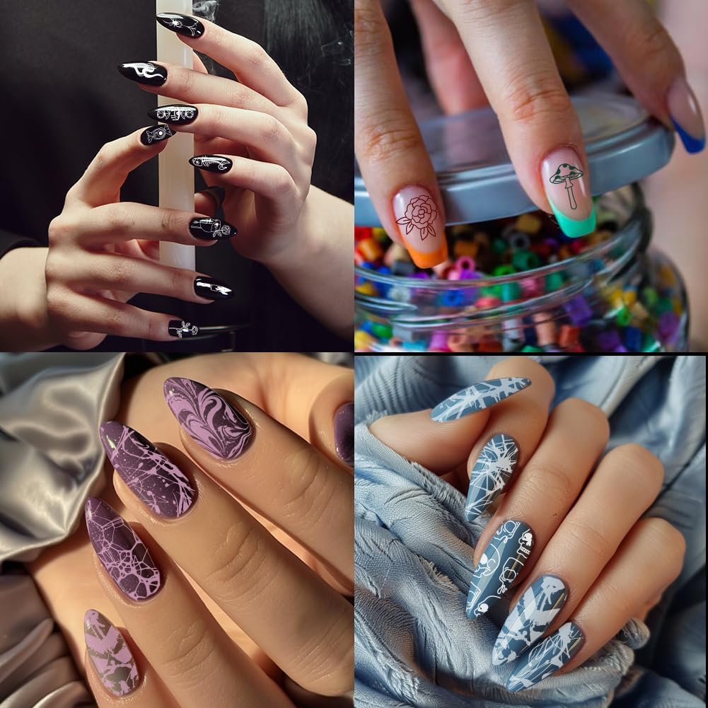 - Punk Style Pattern: 5pcs nail plates with a variety of patterns, including skull, spider web, snake, bat and other horror patterns to meet your different DIY decoration needs. Suitable for Christmas party or costume ball. Enjoy the nail art on your own at home easily. For nail stamping polish (not the regular nail polish) transfer design.