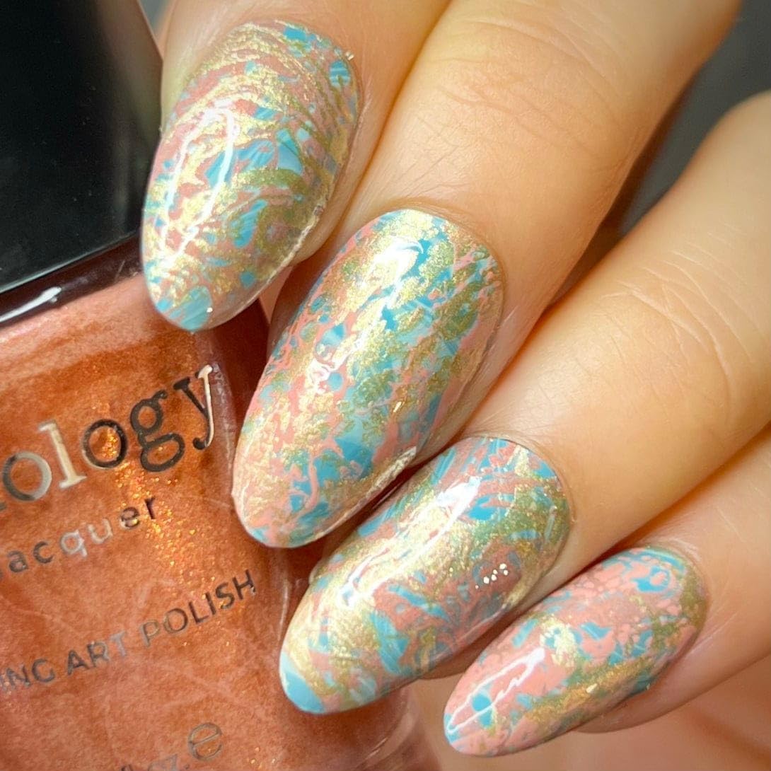 - Flow Art: Unleash the inner artist in you with these unique water-marbling fluid art-inspired nail designs.