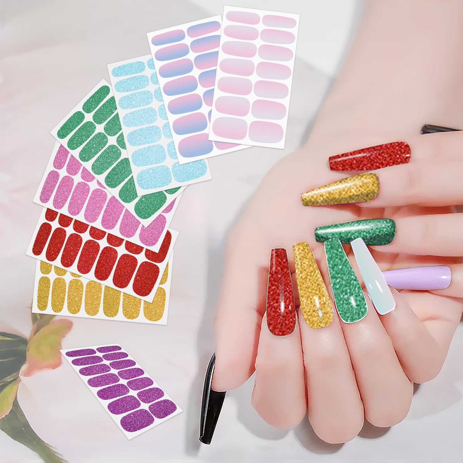 SILPECWEE 16 Sheets Bright Color Nail Polish Stickers Full Nail Wraps Glitter Mermaid Color Gel Strips Self Adhesive Nail Polish Strips Fingernail Sticker Nails for Women with File