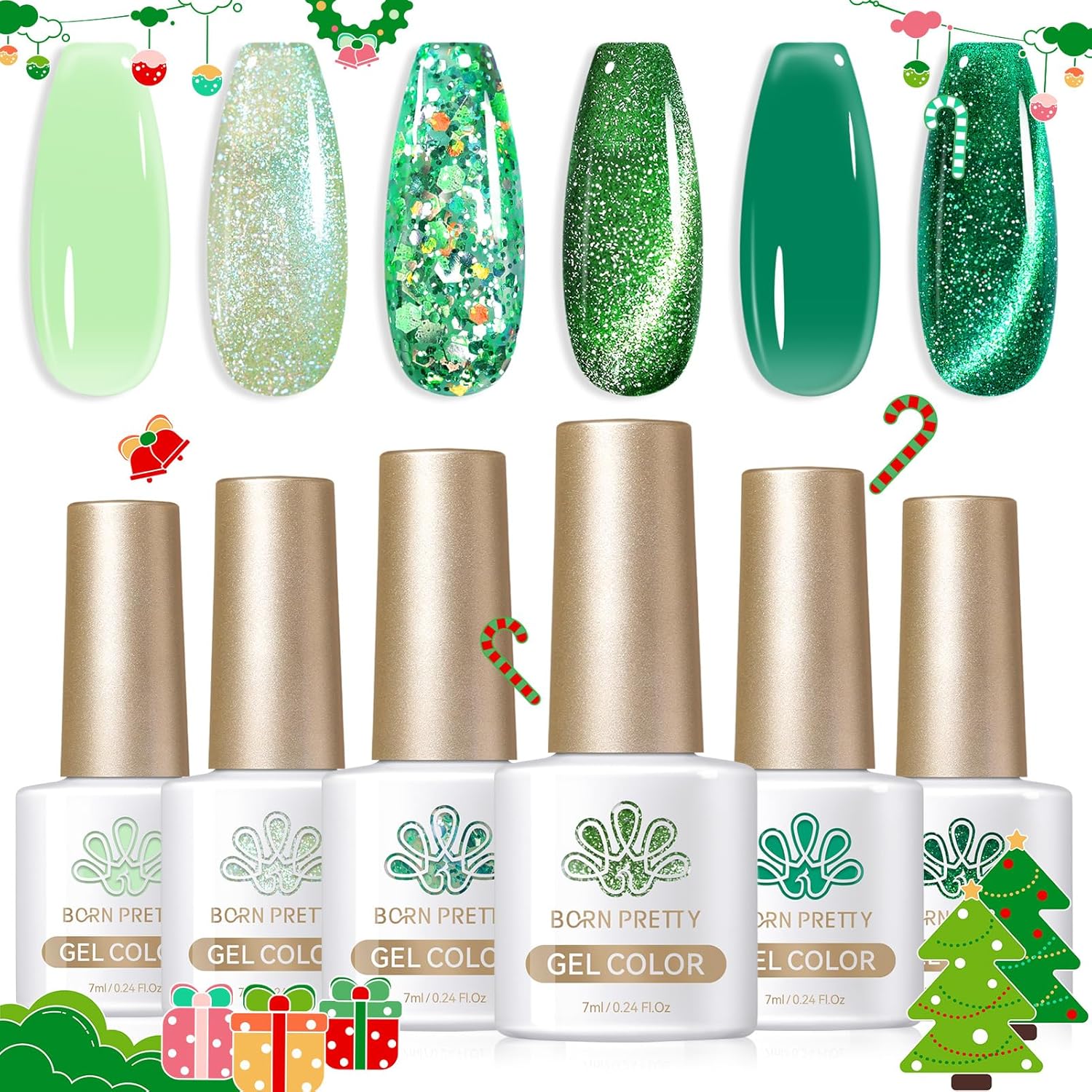 Born Pretty Christmas Green Gel Nail Polish,Jelly Transparent Gel Nail Polish, Cat Magnetic Eye,Shimmer Glitter Holographic Green Gel Polish Kit for Salon Manicure and Nail Art DIY at Home 6PCS 7ml