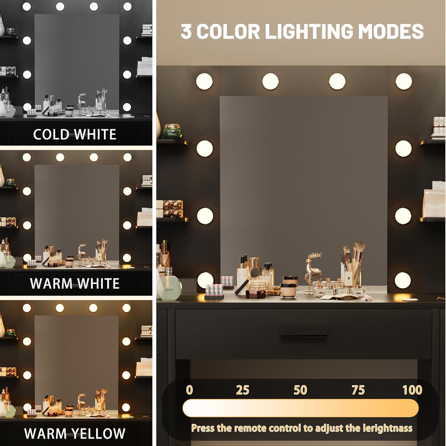 Furmax Vanity Desk with Mirror, LED Lights and Power Outlet Makeup Vanity Table with 7 Drawers and 6 Storage Shelves Dressing Table for Bedroom Dressing Room (Black)