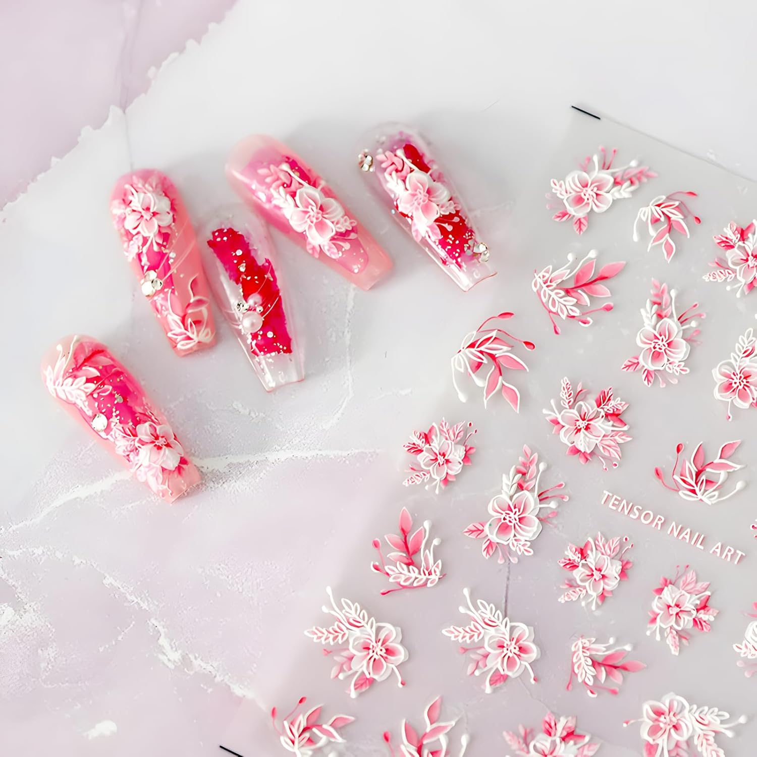 Pink Flowers Nail Art Stickers 5D Embossed Self Adhesive Nail Decals Spring Summer Nail Stickers for Nail Art Flower Nail Design Decoration Accessories for Women and Girls