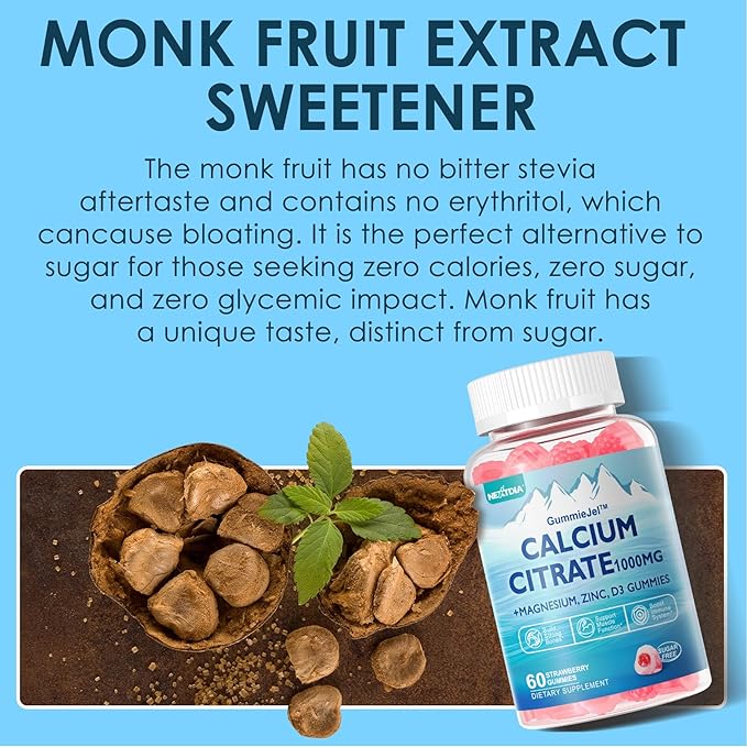 - TASTY, EASY-TO-CHEW, NATURAL INGREDIENTS: Our Calcium Magnesium Zinc Gummies are sweetened with monk fruit, a natural healthy sweetener with low calories. It is 3 to 5 times sweeter than regular sweeteners and has at least 50% fewer calories. These calcium supplement gummies come in a natural strawberry flavor. Sugar-free, gelatin-free, non-GMO, gluten-free, soy-free, wheat & yeast-free, 100% vegan, artificial color & flavoring-free. 3rd-Party Tested.