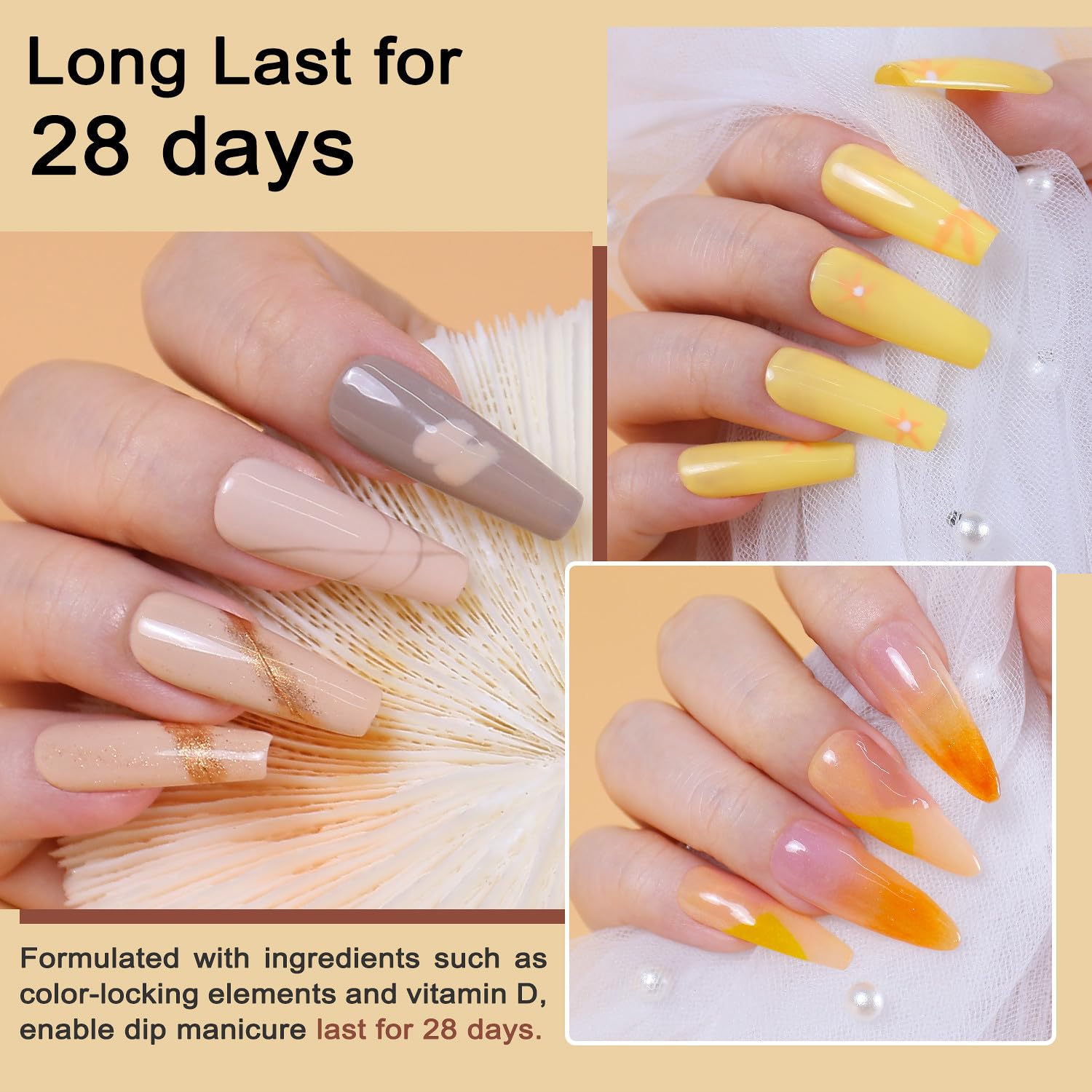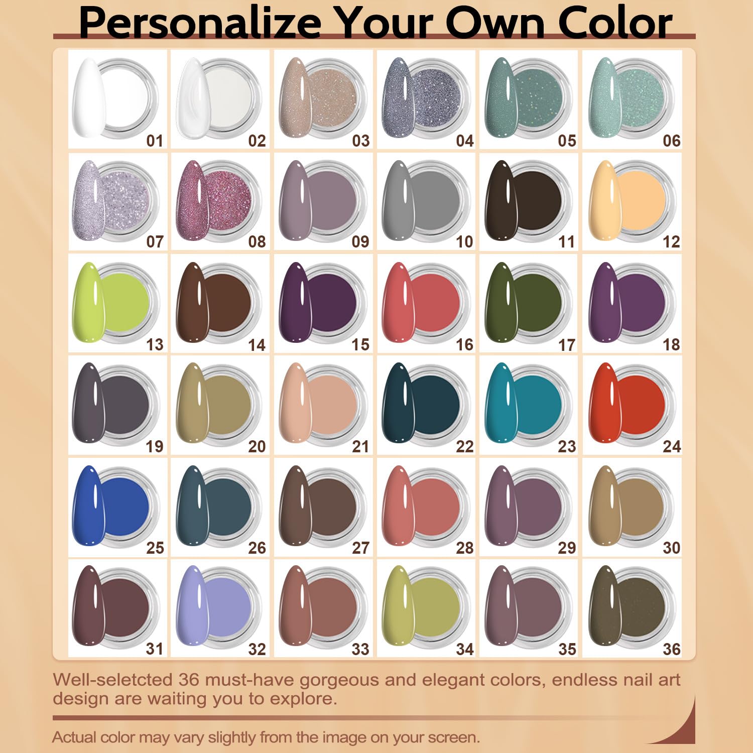 - Long Lasting: Our chip-resistant nail dip powder provides lasting wear for over 28 days, even with daily use. The 36 full range dip powder colors offer more than 6000 possible shade combinations, making this powder nail dipping kit ideal for creating fall-inspired or winter, summer spring nail designs.