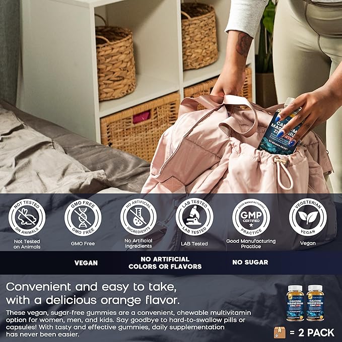 - 【Vegan, Sugar-Free, and Easy to Take】These vegan, sugar-free gummies are easy to chew and are suitable for women, men, and kids. Say goodbye to hard-to-swallow pills or capsules! The delicious blueberry-flavored, high-efficiency gummies make it easier to take your daily supplements (children aged 4-14 should take 1 gummy daily, and teens and adults are recommended to take 2 gummies daily, with a maximum of 2 gummies per day). Convenient for use at home or on the go, you'll never forget to take your calcium, magnesium, and zinc chewables again!