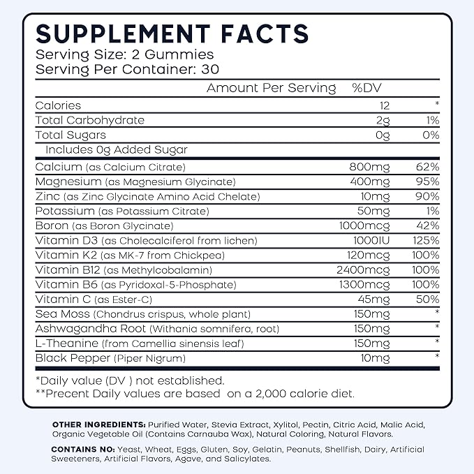 - 【All-in-One Formula】Why take multiple supplements when you can get everything you need from our single gummy? Additional potassium and boron support muscle function and bone health, organic sea moss extract provides extra trace minerals, Ashwagandha supports relaxation and emotional balance, L-thiamine promotes energy metabolism, and black pepper extract enhances overall absorption efficiency. Our professional 14-in-1 formula offers a comprehensive solution.