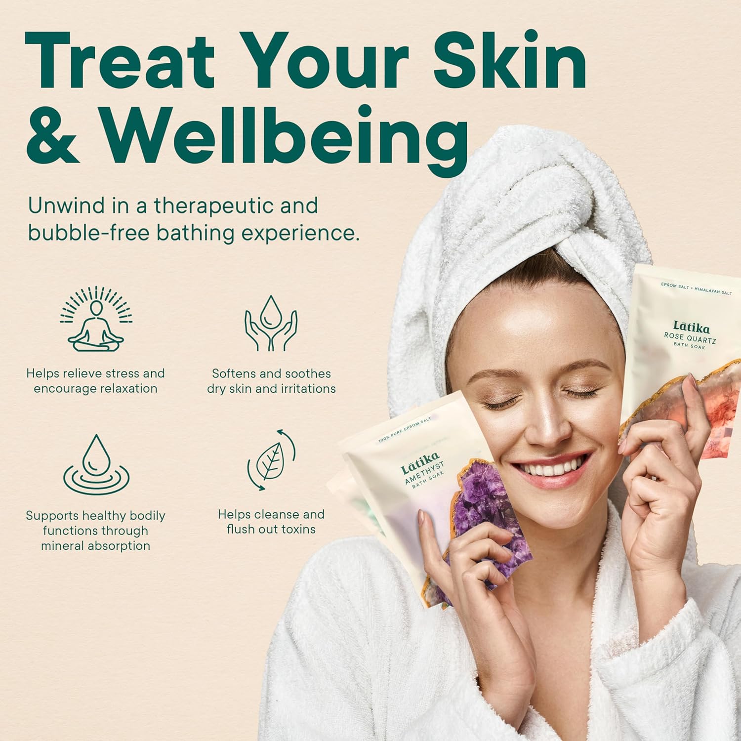 - STRESS RELIEF – Transform your bath into a sanctuary with our Geode-inspired Soak Set of 3, featuring Amethyst, Rose Quartz, and Emerald soaks infused with essential oils like lavender, sage, basil, sandalwood, and eucalyptus. This unique blend of Epsom salt and botanicals is crafted to promote calmness and melt away stress.