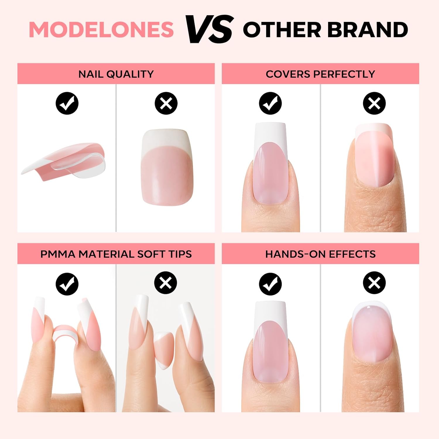modelones French Tip Press on Nails, 150Pcs Long Square Fake Nails with Nail Box, Pink & White Gel Nail Tips for Women, Soft Glue-On Nails for Natural Salon Look, DIY Nail Art Kit (15 Sizes)