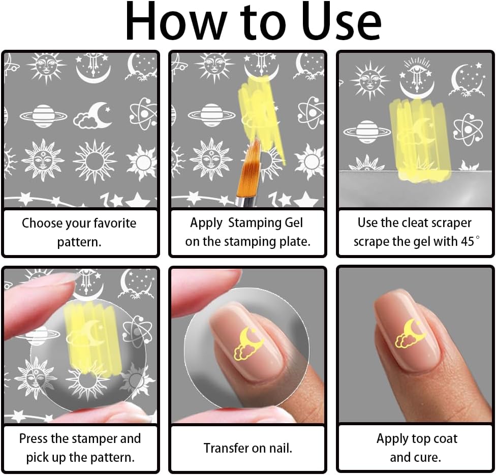 - Easy to Use: 1. Apply paint adhesive to the stencil, then use a scraper to quickly scrape off the excess 2.Use a silicone stamper to press down on the transfer pattern 3. Quickly transfer the pattern onto your nails 4.Bake dry to apply sealer then shine the lamp