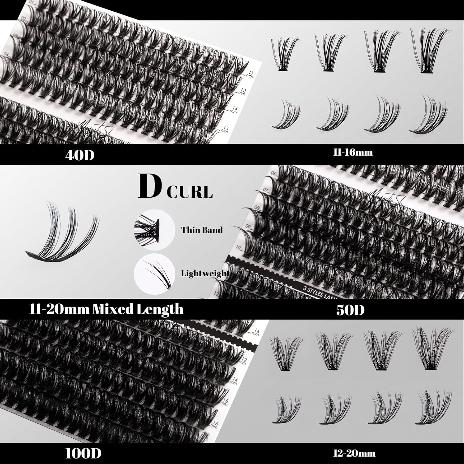 - Different Choices, Different Styles: Use our lash clusters of varying lengths and volumes (11-20mm, 40D, 50D, 100D) to create a personalized eyelash style. Cluster lashes are versatile and suitable for various occasions, whether you're having a night out with friends, attending a special event, or at working day. You'll complete all these looks in no time!