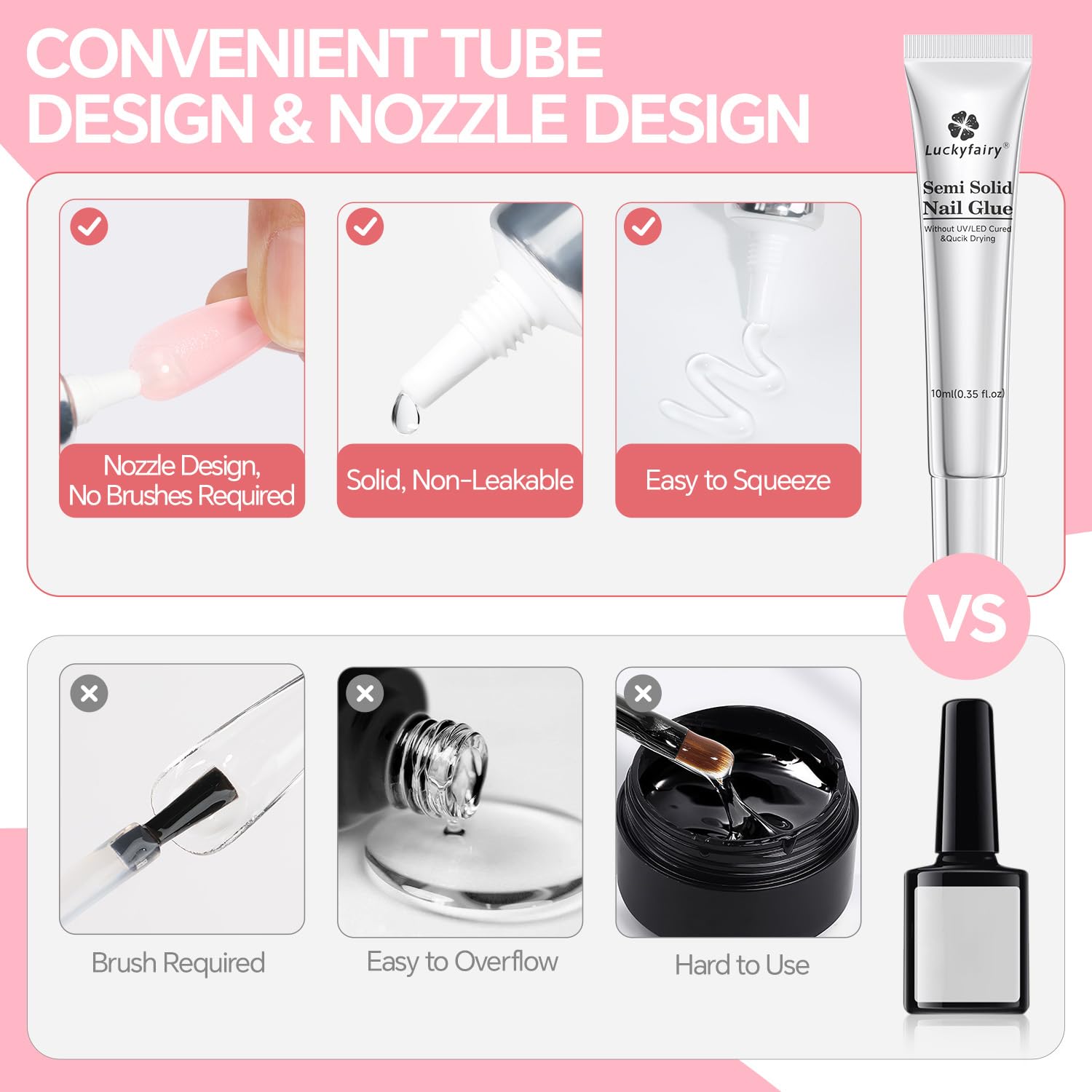 - Widely Used: Luckyfairy Semi Solid Nail Glue can safely stick clear nail tips, French nails, press-ons, and rhinestones for versatile DIY or salon use. Warm tips: No contact with water for one hour after use.
