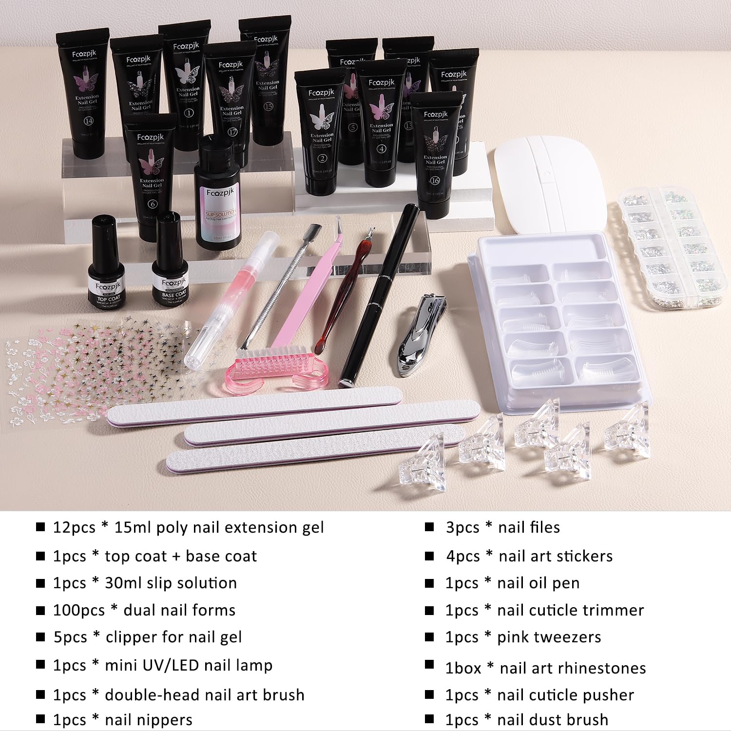 - 【Nail Art Kit With Everything】 You will receive 12pcs * 15ml poly nail extension gel (6pcs solid color + 6pcs glittery color) ,100pcs * dual nail forms,1pcs * 30ml slip solution,1pcs * double-head nail art brush,5pcs * clipper for nail gel,1pcs * top coat + base coat,1pcs * 6W mini UV/LED nail lamp, 4pcs * nail art stickers,1pcs * nail oil pen,3pcs * nail files,1pcs * pink tweezers,1box * nail art rhinestones,1pcs * nail cuticle pusher,1pcs * nail cuticle trimmer,1pcs * nail nippers,1pcs * nail dust brush