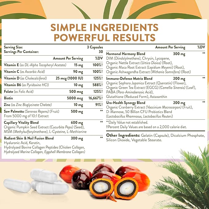 - Maximum Potency Saw Palmetto DHT Blocker: Our formula includes 500 mg of Saw Palmetto (10:1 extract), a powerful DHT blocker for women’s hair growth. Combined with 5000 mcg of Biotin, this herbal supplement nourishes hair from within. We understand the challenges women face as they age, which is why we’ve specially formulated this potent hair supplement to meet the evolving needs of women