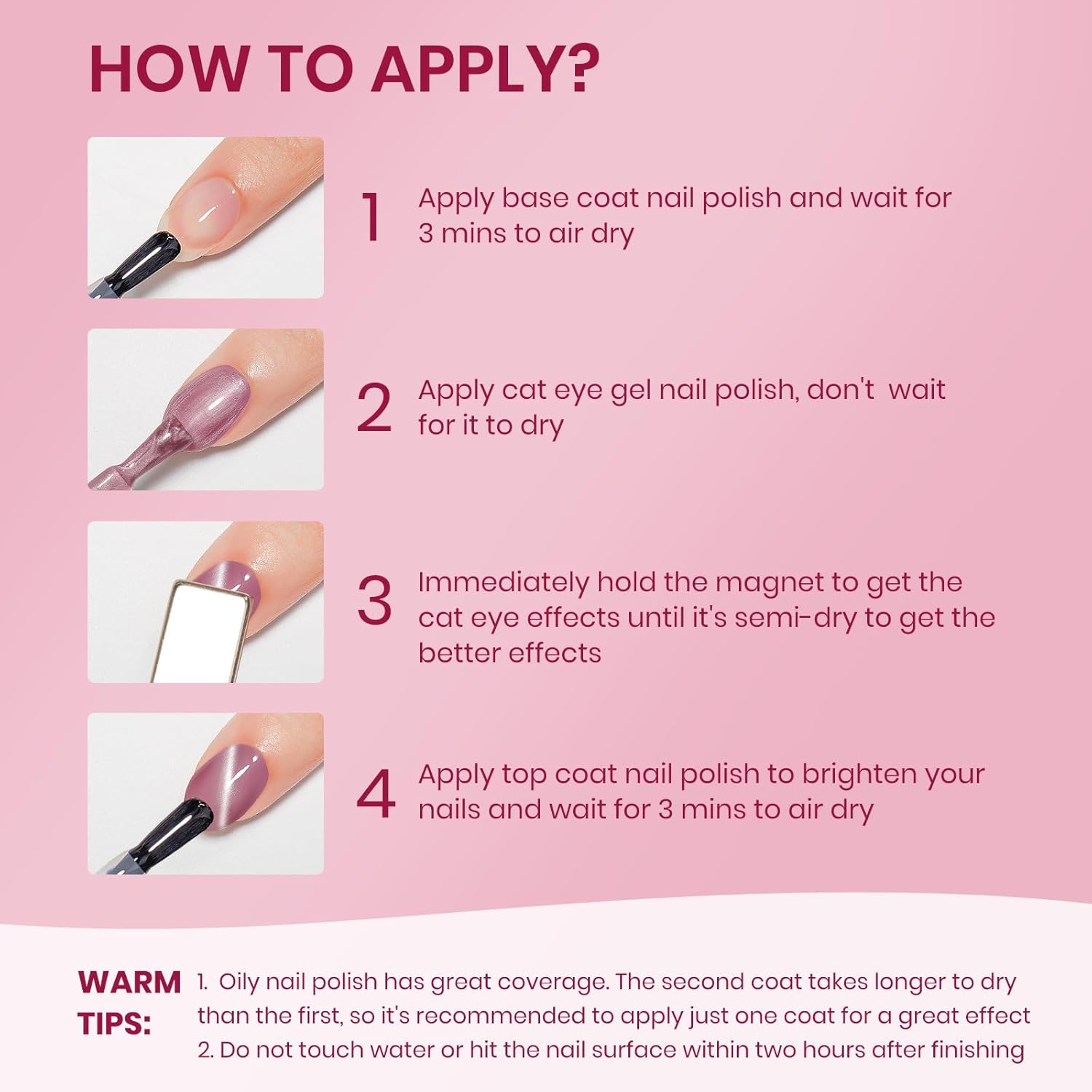 - Important Tips: 1. When the nail polish is not dry yet, it will be fluid. Use magnets to hold it in place until it's semi-dry, then take them off for a sharp cat-eye look 2. Do not touch water or hit the nail surface within two hours after finishing to avoid peeling; 3. Base and top coat nail polish art necessary