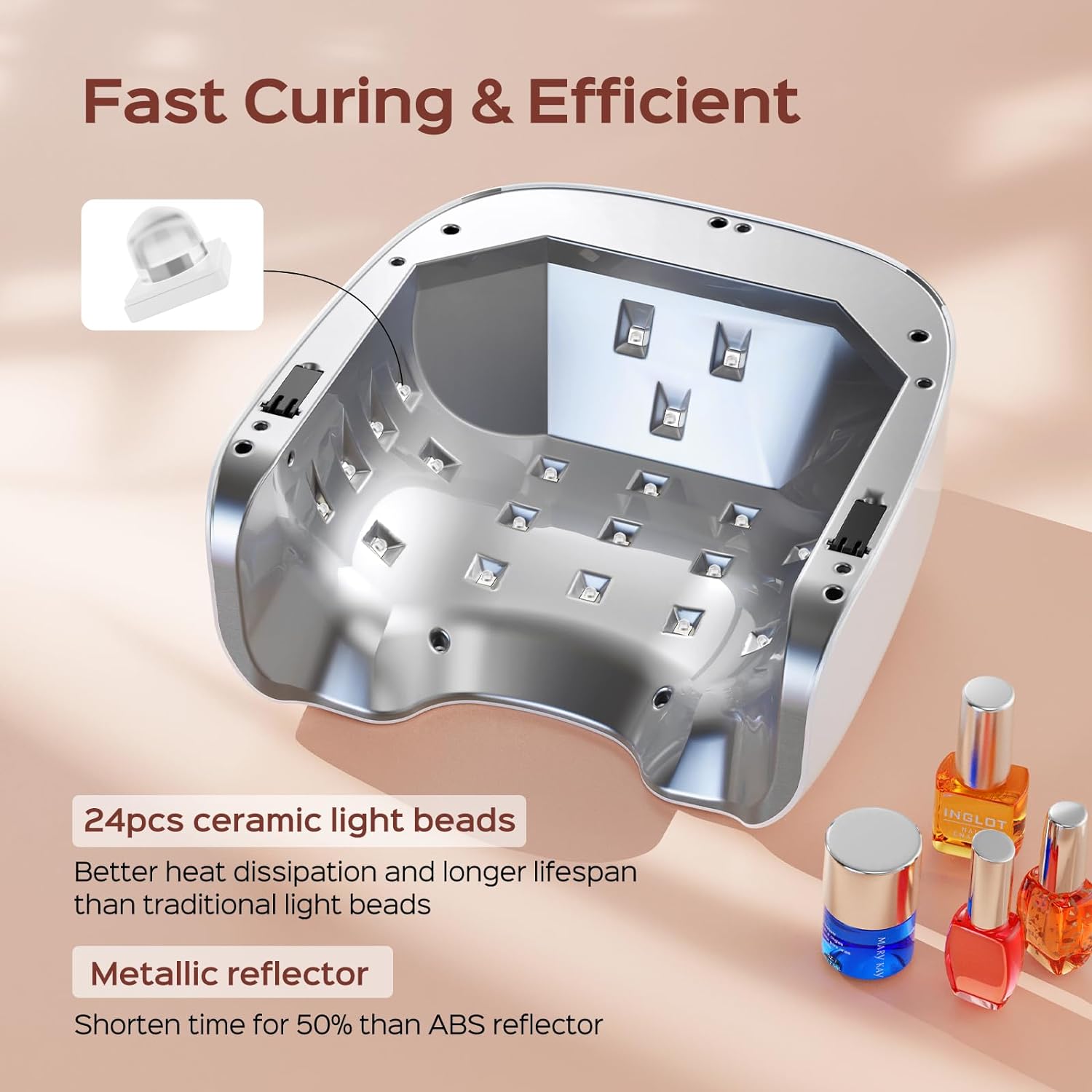 - [Smart Sensor and Adjustable 4 Timers] Built-in infrared sensor lights, the UV LED nail lamp automatically turns on when you place your hand or foot inside, and turns off when you take it out. It is adjustable in 4 timer settings of 15s/30s/60s/99s, which can be selected according to the time for different gel nails.