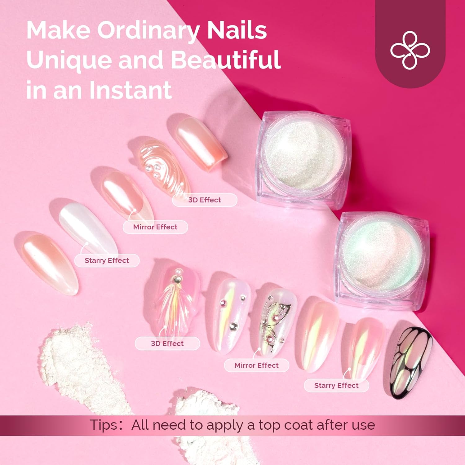 - Wide Range of Applications: Suitable for UV gel nails,acrylic nails,natural nails or false nails.Easy to get a salon grade chrome effect without special techniques.Powder is easy to apply and suitable for beginners