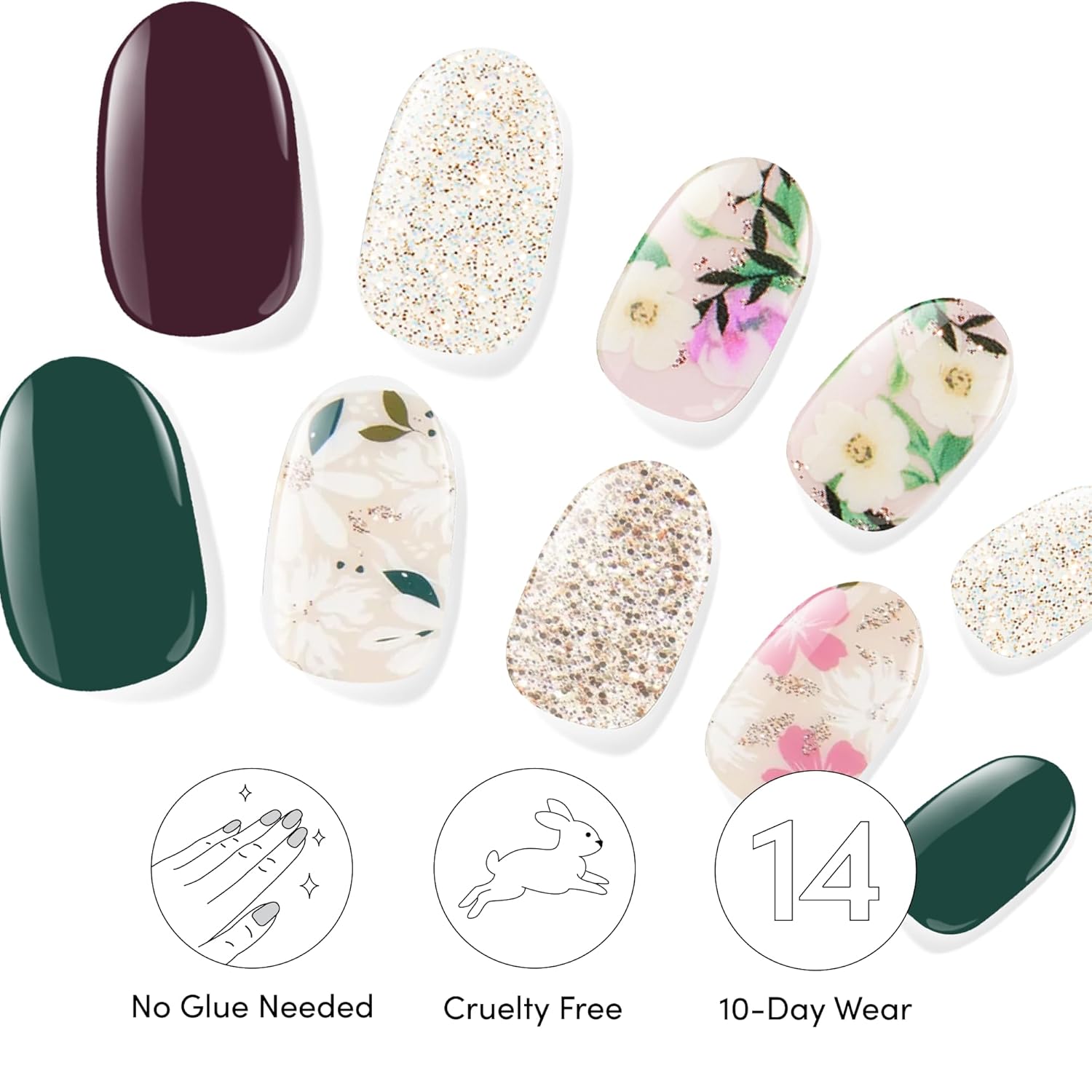 - Long Lasting Gel Strips: The glossy gel nails you desire, minus the polish. Our chip resistant, easy-to-apply gel nail strips require zero dry time and last up to 14 days. Create your custom mani in minutes. Press. File. Go!