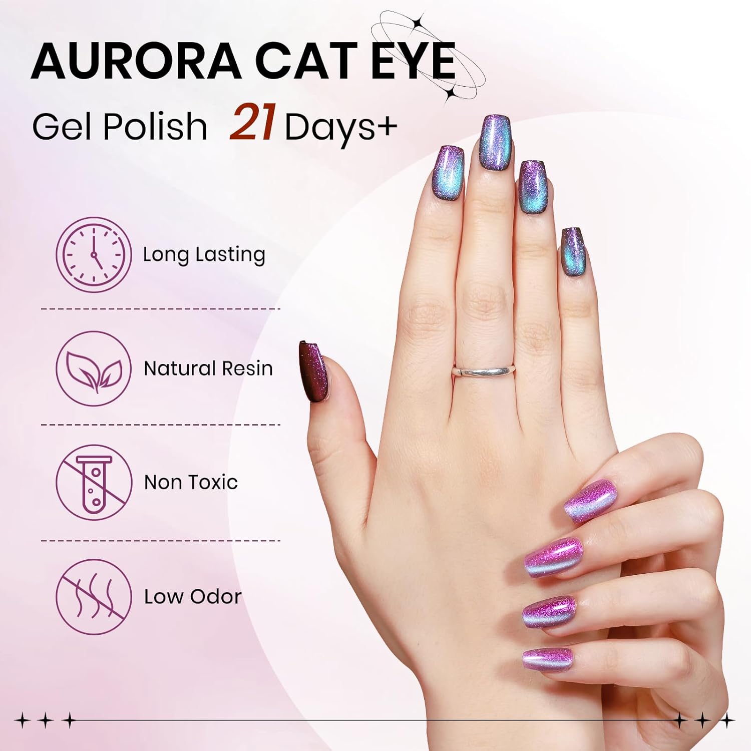 - Aurora Cat Eye Gel Polish: 1*15ml(0.5fl oz) aurora pink cat eye gel nail polish with 1pc magnetic stick. Suitable for all occasions to wear, both daily and special occasions can show a unique style.