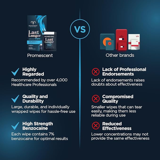 - HIGHLY REGARDED: Promescent, a specialized delay wipe enhancing couples' sexual experiences, garners substantial trust and endorsement from over 4,000 healthcare professionals in the United States.