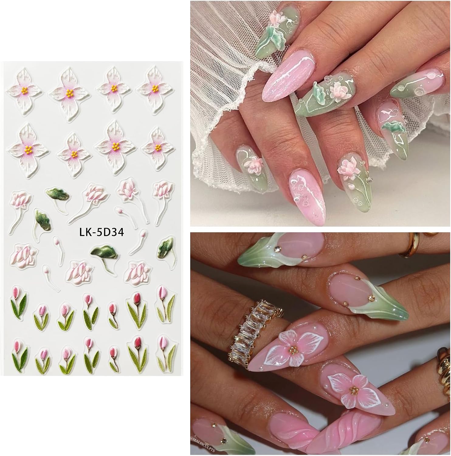 Nail Art Stickers Decals 5D Embossed Flower Nail Decals Self Adhesive Spring Summer Plumeria Tulip Supplies 3D Nails Design for Women Decoration Pink Flower Nails Sticker