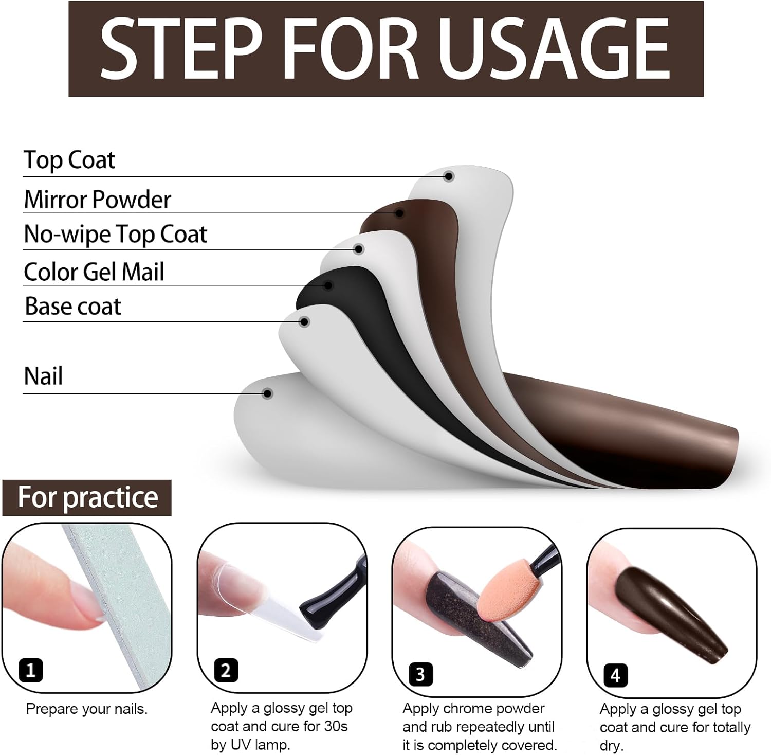 - The Scope Of Application:All chrome powders should only be applied to glossy No wipe top coat to embellish Nail-Polishes color. Otherwise it is unusable, it can't be applied directly to the nail, and it can't be applied directly to the skin. Artdone chrome powder can be applied on UV gel nails, acrylic nails or false nail tips. You can use them very easily