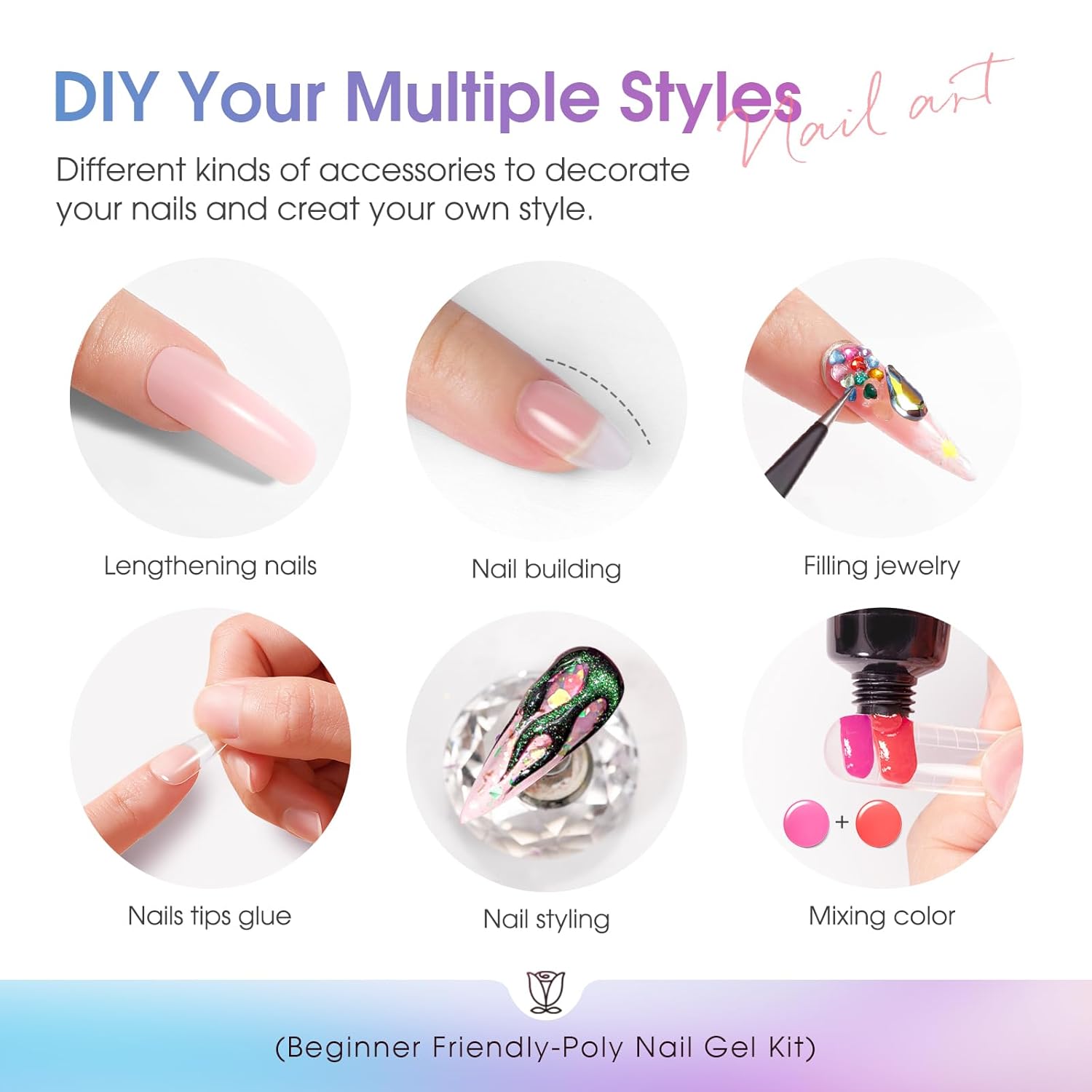 - Suitable for beginners:Our poly nail gel starter kit provides a operating Instructions to help you to DIY nails at home. 16 different colors, from nude to pink, cover all daily poly basic need, Moreover, our Nail Art box kit provides sparkling nail art accessories (glitter, lines, rhinestone) to help you realize novel nail art.