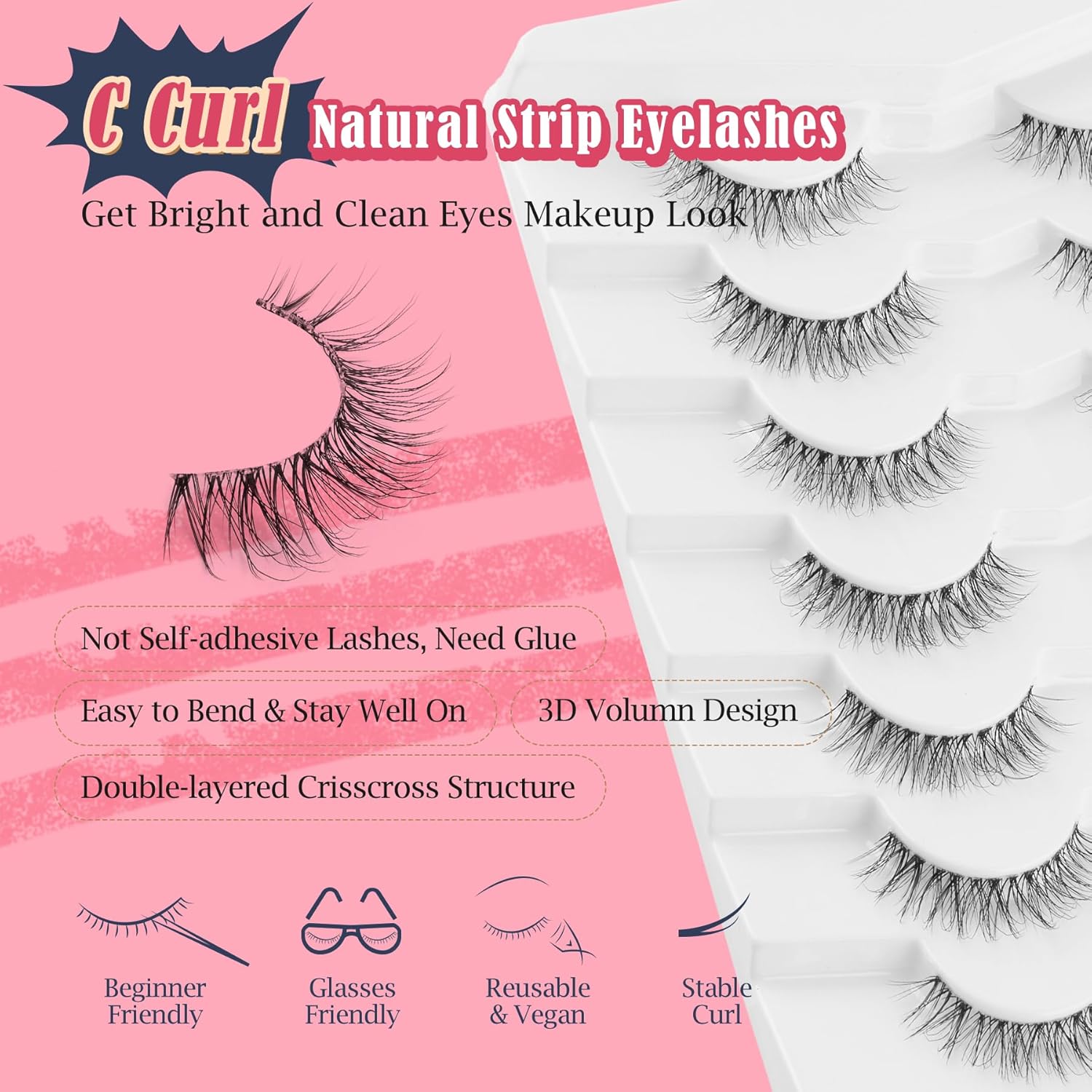 - STRIP LASHES NATURAL LOOK: Length: 7 mm -12 mm, short lashes, glasses friendly. Natural daily design, making a brighter and charming eyes effect, adding volume to your eyelashes and keep a clean makeup look, small eyes friendly