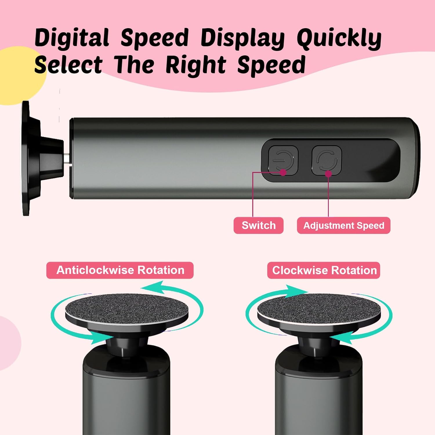 - 【9-Speed Adjustable】Speeds 1-3 for sensitive skin, 4-6 for daily exfoliation, and 7-9 for stubborn calluses. Features a 2-second hold-to-start function for safe operation