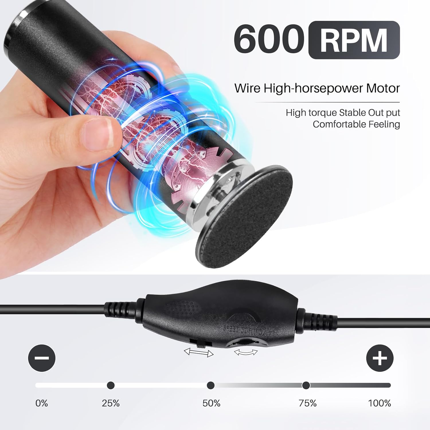 - 【Profesional Pedicure Tool For Feel】The motor of our foot callus remover is made from high-density material,Equipped with High-Precision Motor (0-600 RPM max) ,This allows for rapid acceleration and instant deceleration, Plug-in power is designed to provide strong, continuous power that not only eliminates the need to recharge batteries, but also saves time and effort compared to manual foot file.