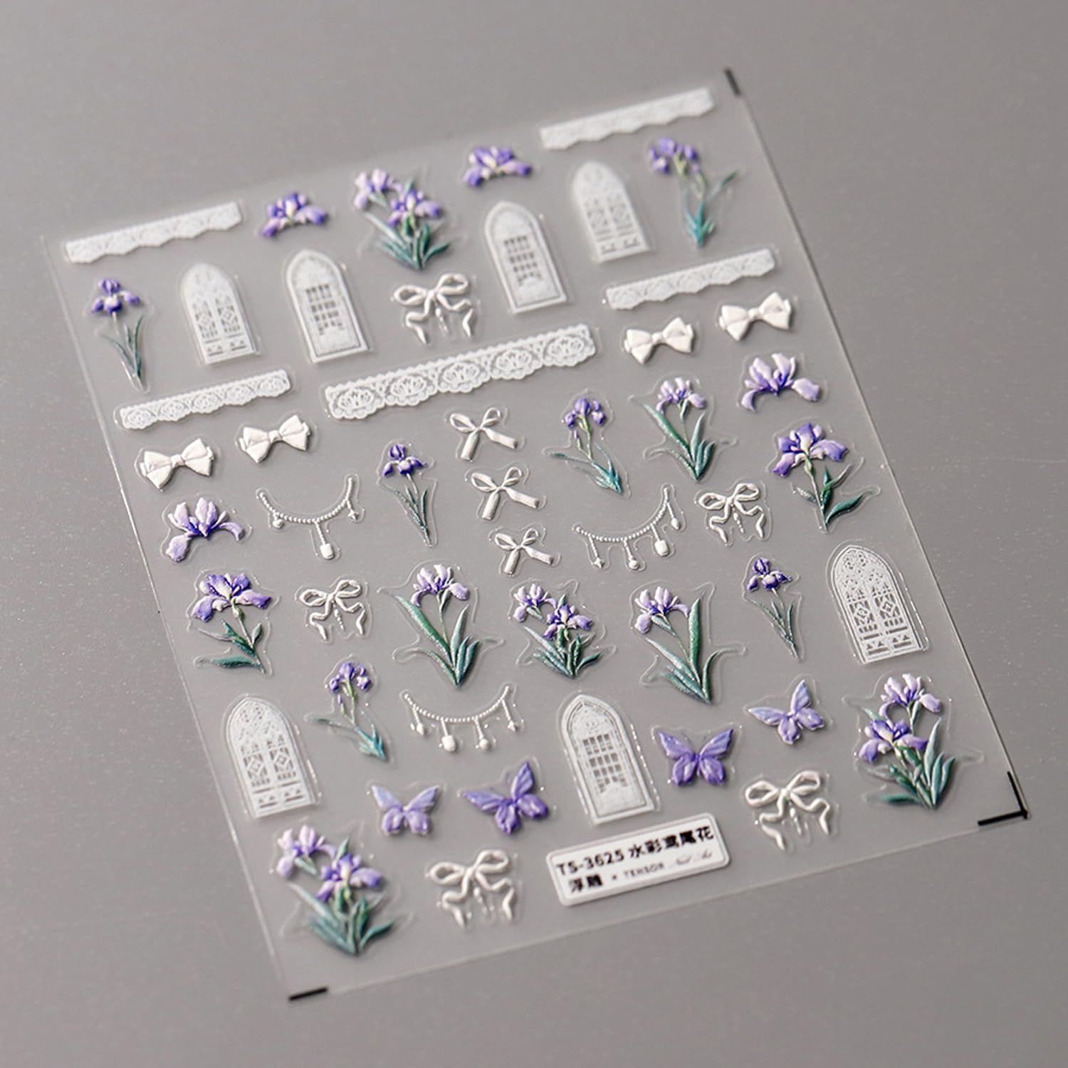 Flower Nail Sticker, 5D Embossed Iris Floral Nail Art Stickers Self-Adhesive Bows Butterfly Nail Decals for Women Nail Supplies Art Design Sticker(1, Iris Flower)