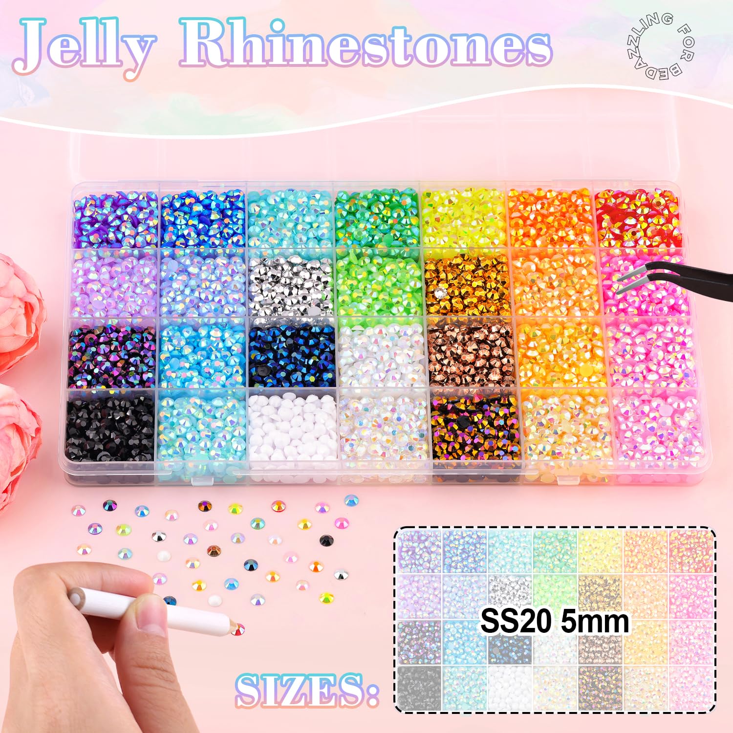 - PACKAGE CONTENT -- Include 1 box with 28 grids, featuring a variety of colors, approx. 8000 pcs bling-out resin rhinestones (5mm). 1 tweezers and 1 pickup pen are included for easily picking up of rhinestones. 1 B7000 glue for jewelry making
