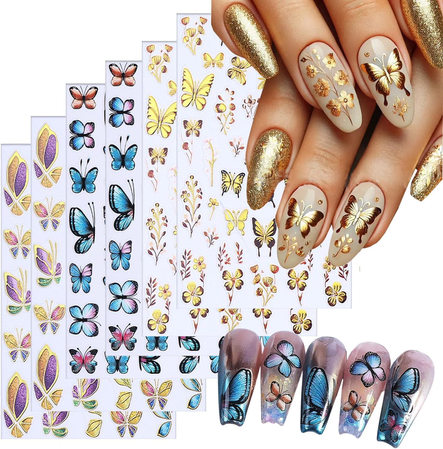 - Quantity:You will get 6 sheets butterfly nail art adhesive stickers, each paper measure 3.5 x 2.5 inches(9 x6.5cm). Gold blue butterflies patterns for your choice, these nail stickers are perfect for matching other nail art