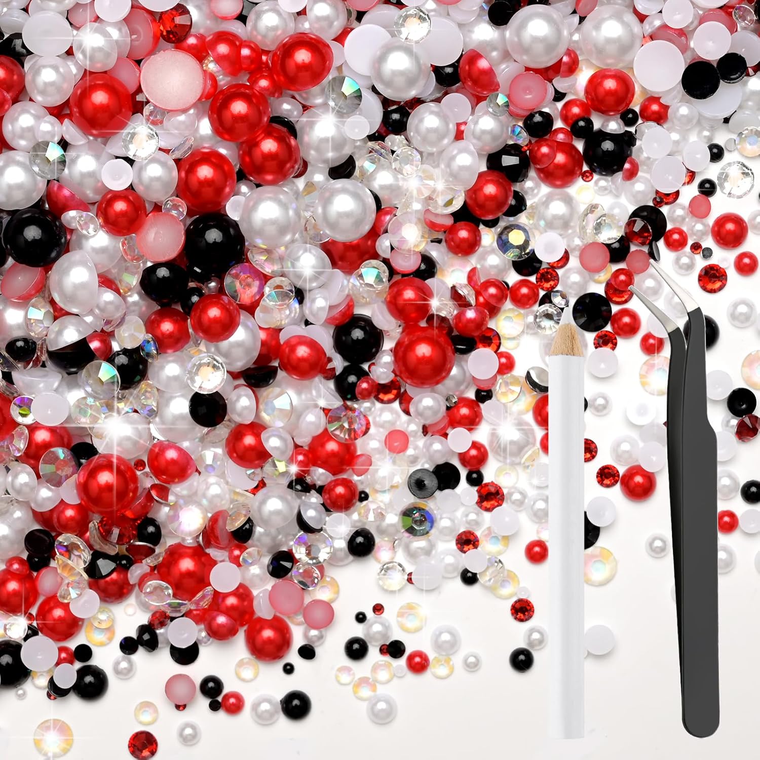 80g Mix Flatback Pearls and Rhinestones for Crafts Red Black and White Mixed Size 2mm-10mm Half Round Pearls Rhinestones for Nail Art Tumblers Shoes DIY Bedazzling with Tweezers Wax Pen