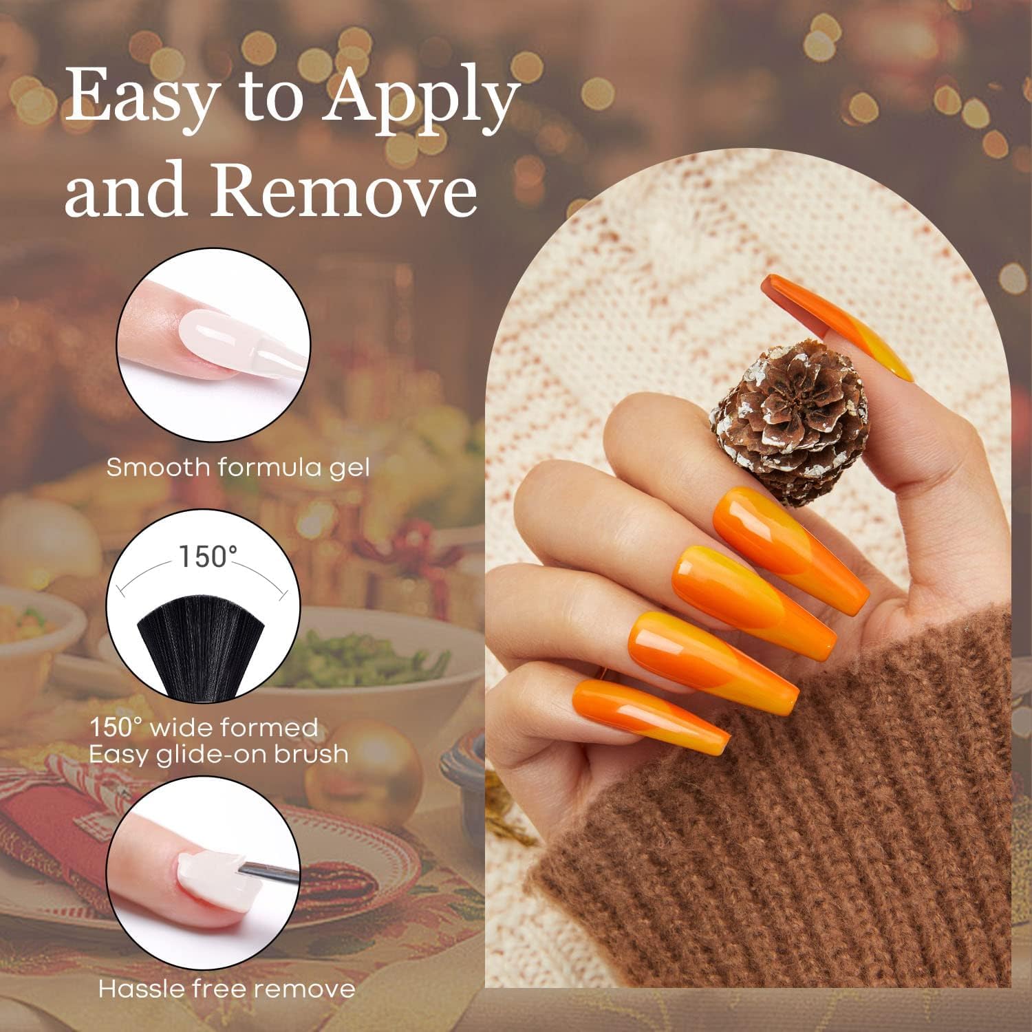 - [Fall Winter Gel Nail Polish Kit]: 6 of the most iconic and trendsetting colors - Carrot Orange, Glitter Red, Dark Red, Coffee Brown, Nude Tone, Wood Brown