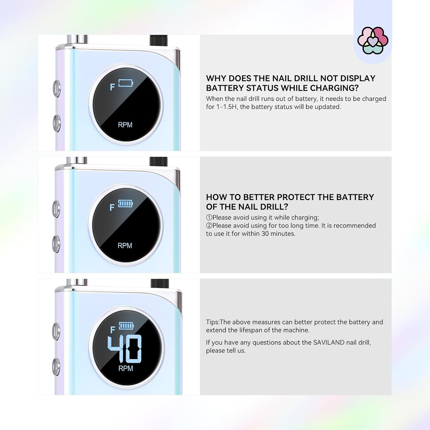 - Long-Lasting Battery Life Featuring: A 6000 mAH battery, Saviland nail drill for acrylic nails guarantees extended usage for uninterrupted nail art sessions. With a large capacity battery, you can rely on consistent and stable performance, enhancing work efficiency and precision. Perfect for on-the-go or outdoor environments where power outlets are scarce, offering unparalleled convenience.