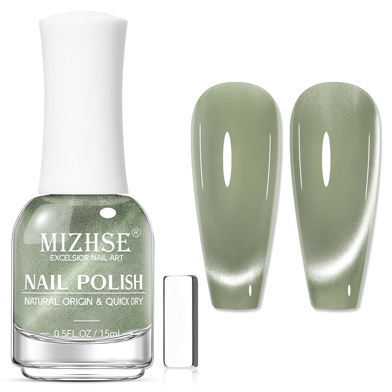 MIZHSE Quick Dry Cat Eye Nail Polish, Green Magnetic Nail Polish with Magnet, Air Drying Fast 15ml Cateye Nail Lacquer for Women Girls Non-Gel Nail Art Manicure DIY Home