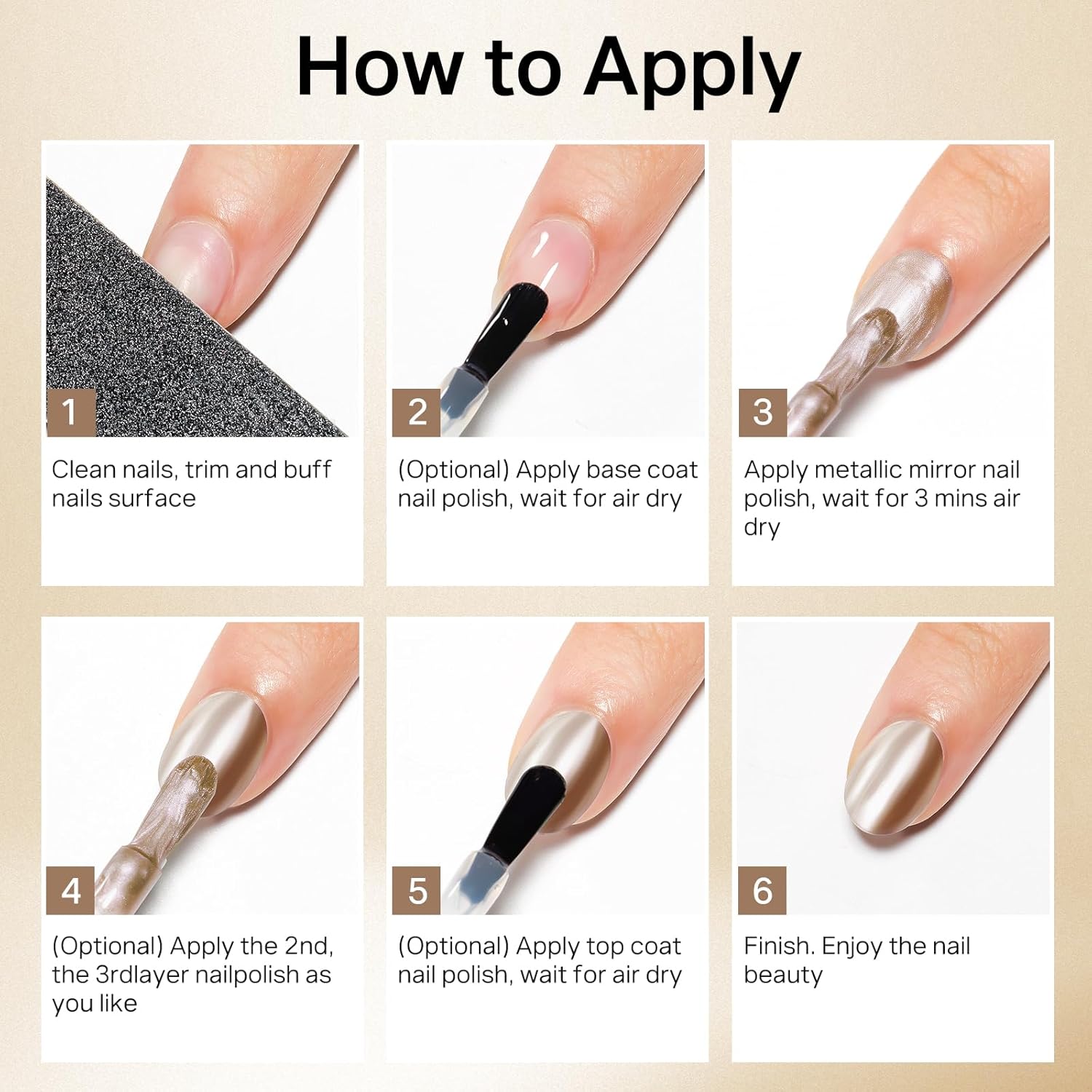 - Trendy Mirror Nail Polish: 1*15ml larger bottle nail polish - Champagne. Perfect for daily wear, work, parties, trips, beaches, and any occasion where you want to add a pop of color to your look. Highly versatile and easy to apply, this elegant shade will steal the show wherever you go.
