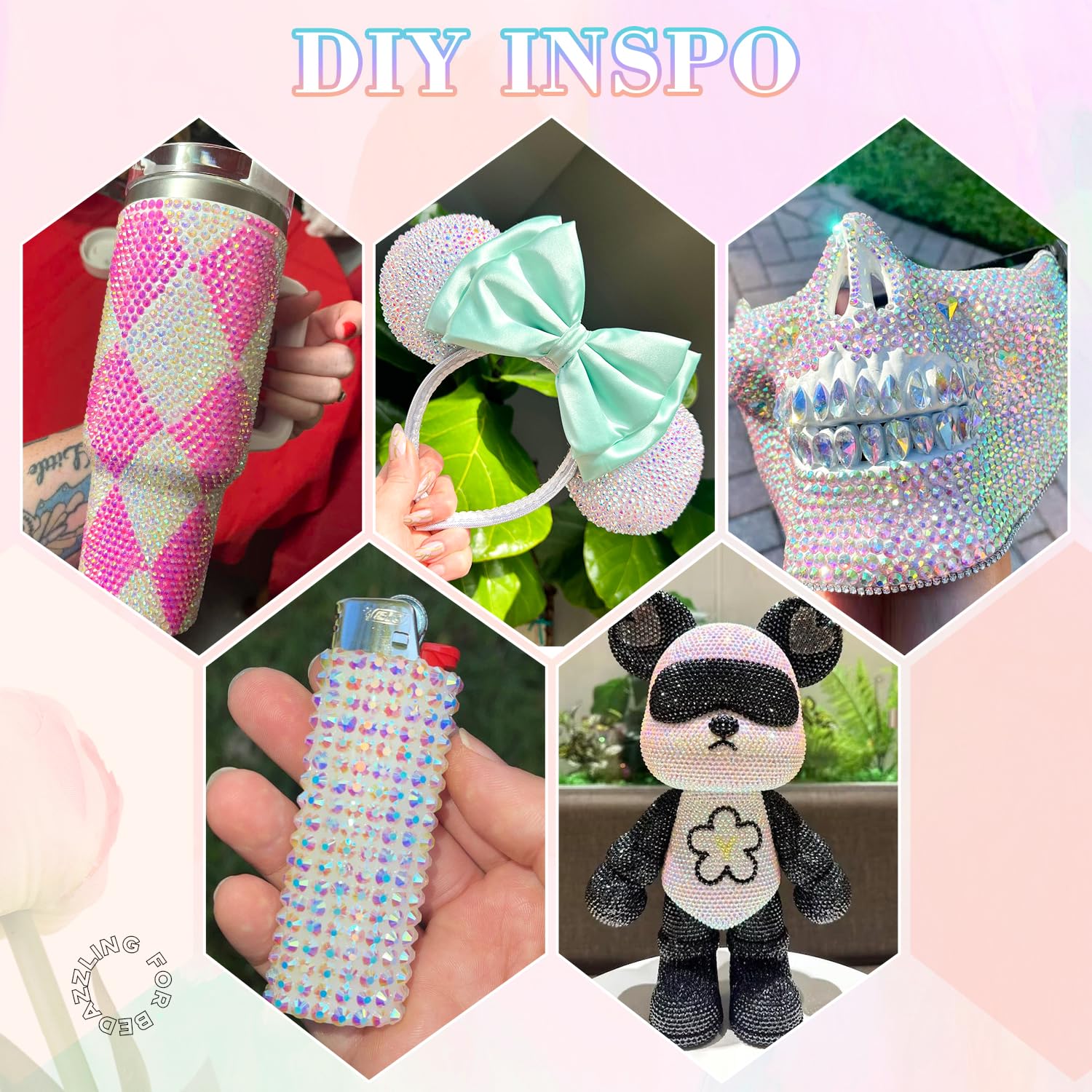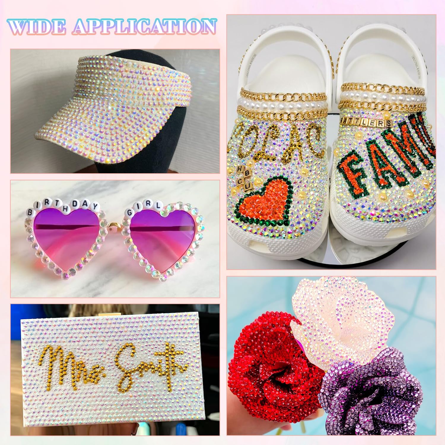 - PACKAGE CONTENT – This all-in-one bedazzler kit includes everything you need to start creating dazzling designs: 1 box of Transparent AB rhinestones with 24 grids (approx. 30,000 pcs of bedazzling rhinestones assorted size SS6/10/16/20/30 ), 1 precision tweezers, 1 pickup pen for handling small gems, and 3 tubes of B7000 jewelry glue for secure application.